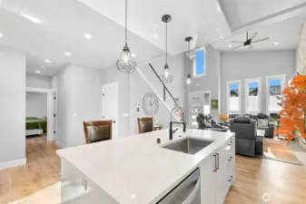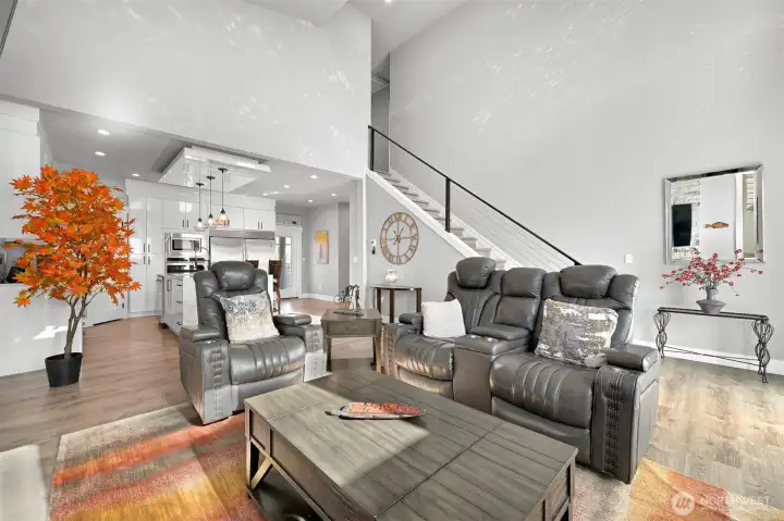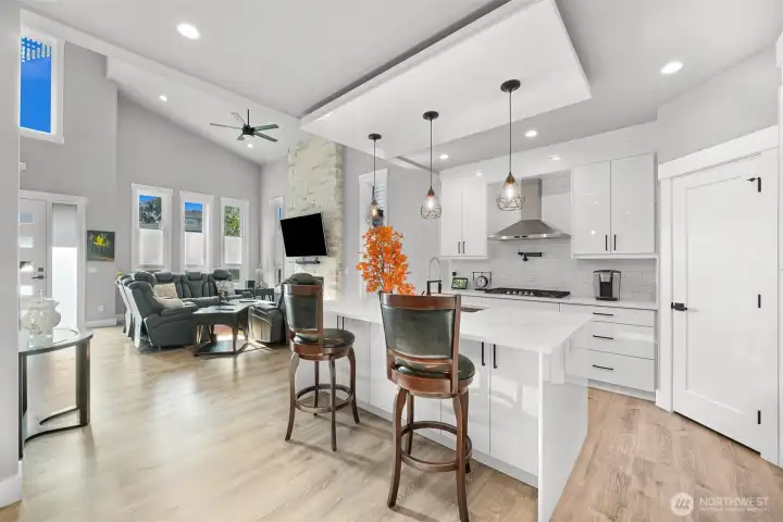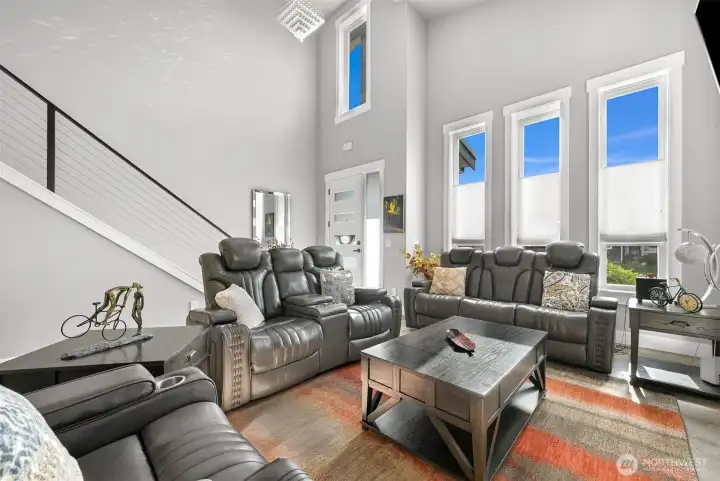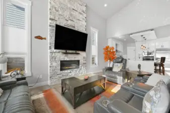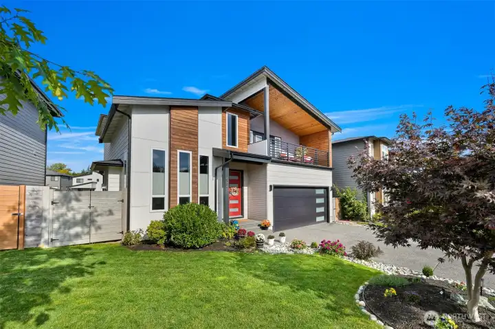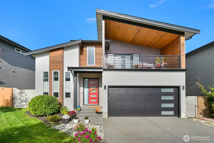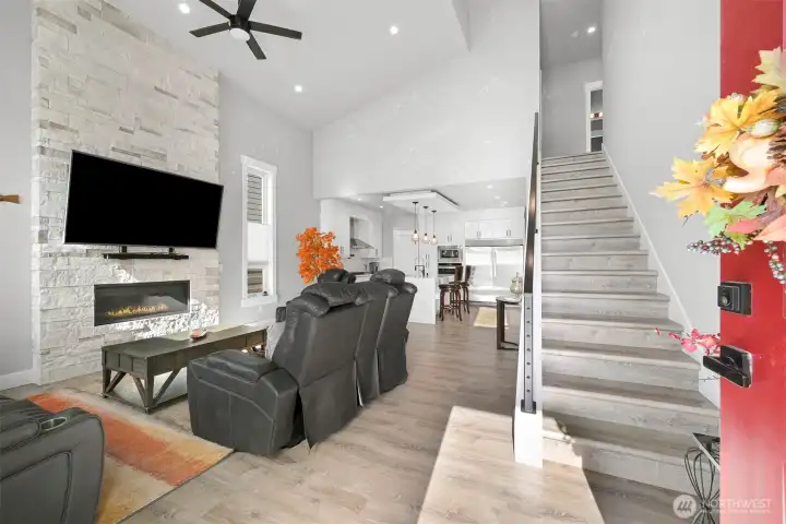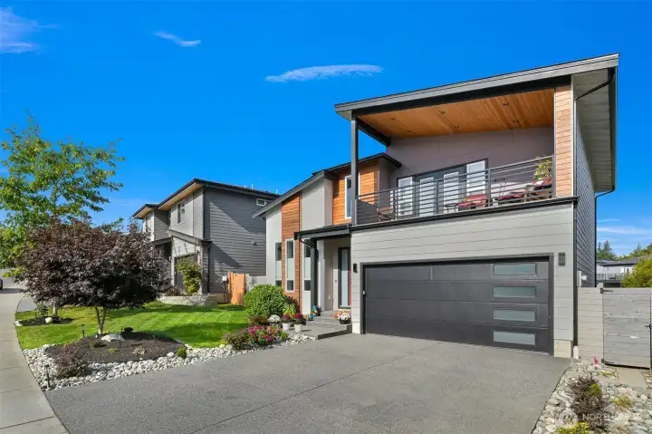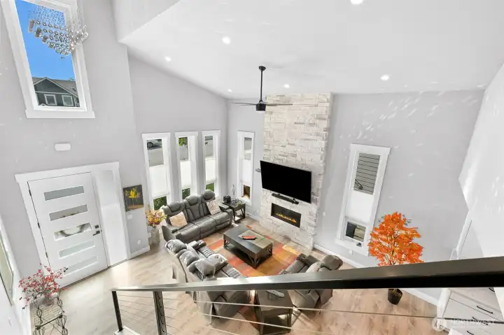 One of Ferndale's modern elegance in desirable Malloy Terrace. This open and spacious 4-bedroom home welcomes you with soaring 19 ft ceilings in the living room anchored by a gorgeous floor-to-ceiling rock wall fireplace. Chef's kitchen features sleek waterfall quartz counters, a walk-in pantry, & double fridge. One bedroom on main sits adjacent to a full bathroom. The primary suite upstairs offers a walk-in closet, bathroom w/ double vanity + step-in shower, and French doors that lead to its own covered deck. Fully fenced yard backs to the community greenspace & trail. Close to Vista Ridge Park & Cedar Creek Park plus easy access to I-5 via Thornton Overpass. Come and see this gem!
