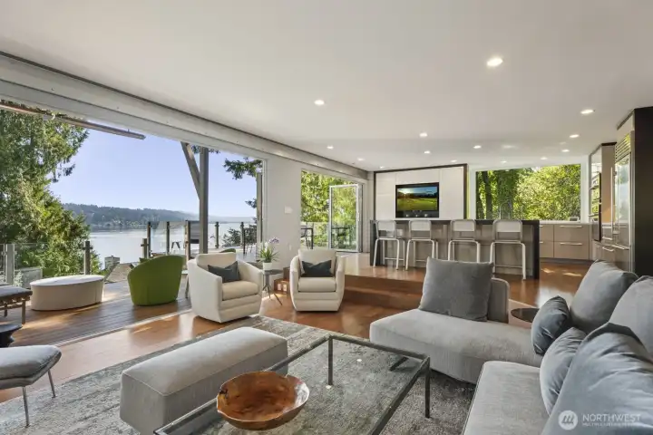 Experience lakefront living at its finest. Spectacular fully renovated home is move in ready. Thoughtfully designed throughout-Dramatic Nana walls open seamlessly to a full-length heated deck for year-round indoor/outdoor living. Gated 40 ft of prime waterfront with new dock (shared with one home) private boat lift. Privacy and exclusivity with easy waterfront access. Breathtaking lake & mountain views, circular drive, 2-car garage & central A/C. Whether it's morning coffee on the deck or dock or afternoons on the boat this home blends luxury, lifestyle and the beauty of the Pacific Northwest. Just minutes to downtown Bellevue & Redmond + Weowna Park trail. "Moving to Lake Sammamish, the BEST move you'll ever make!"