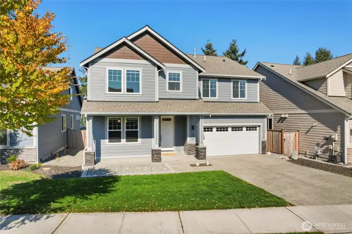 Move-in ready + beautifully updated! Upgrades throughout including all-new white painted trim with 5” baseboards, 8’ entry door, new interior + exterior doors, fresh paint, cordless blinds, and upgraded lighting with added recessed + vanity fixtures. Enjoy durable 12MM laminate flooring throughout—no carpet! The gourmet kitchen shines with slab granite counters, stainless appliances, new hardware, and a custom ceiling detail flowing into the inviting great room with gas fireplace. Upstairs offers 4 bedrooms, 2.5 baths, a versatile bonus room, and laundry. Added perks: repainted deck, refreshed landscaping with premium topsoil, new 16’ garage door, hot/cold hose bib, and A/C added in 2024. Ideally located near I-5, JBLM, shopping + schools!