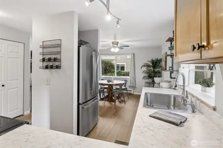 Discover this beautifully updated end-unit townhome in sought-after Hudson Ridge, perfectly located in the heart of Des Moines. The main floor offers an inviting open layout with living, dining & kitchen spaces and a convenient half bath, all featuring brand-new flooring & updated kitchen counters. Upstairs you’ll find a spacious Primary with double closets & private access to the full bath, along with two additional bedrooms & laundry nearby. Step out to your cozy back deck to enjoy the park-like grounds or take advantage of the summer pool, year-round cabana/gym & two designated parking spots. Conveniently situated near the Marina District, with easy access to freeways & light rail for effortless commuting - Hudson Ridge is calling!