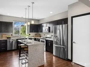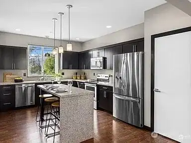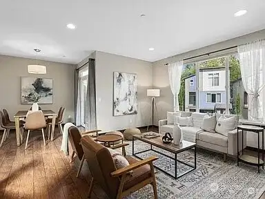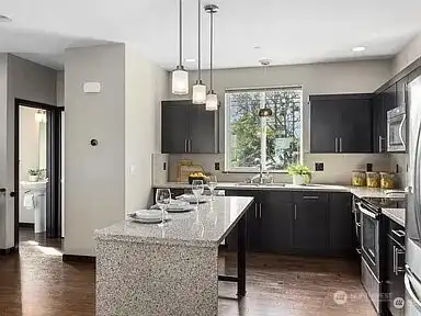 Welcome to this stunning 2015 contemporary style home. Prime location, yet tucked back in a quiet neighborhood. The main floor offers cathedral ceilings and an open concept floor plan perfect for entertaining Insulated windows. In the kitchen you'll find newer stainless steel appliances, quartz counter tops and an abundance of cabinetry. Upstairs find two good sized bedrooms with full bath, W/D and a3rd Primary that feels airy and bright with vaulted ceilings, walk in closet w/ en-suite. Enjoy the convenience of being walking distance from Ash wood park & ride & light rail. Minutes from shopping, dining, I-5 & I-405, Edmonds School District. Virtually staged