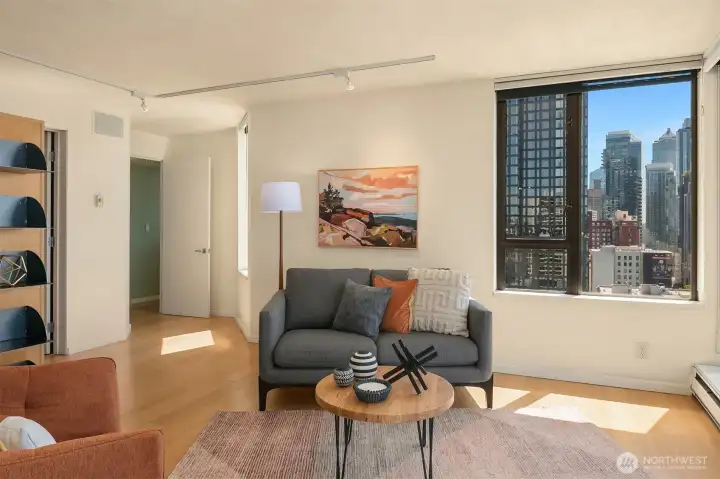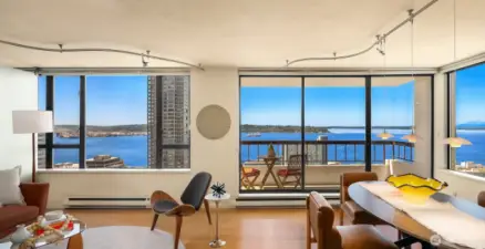 BIG PRICE ADJUSTMENT Spectacular western views of Elliott Bay, the Olympics, and downtown greet you in this beautifully remodeled 1463 sf corner unit at the Grandview in Belltown. Designed to maximize space, this architecturally unique home features gorgeous built-ins, a chef’s kitchen w/island and breakfast bar, new bamboo floors, dining area, living room, den/office, w/d, powder room and spacious primary suite Floor-to-ceiling windows w/three private balconies showcase panoramic water and city views. Enjoy top-tier amenities: indoor pool, hot tub, sauna, fitness center, rooftop deck, guest suite, BBQ area, internet. HOA dues cover ALL utilities. Pet-friendly, no rental cap, secure parking, storage, close to Seattle Center & Pike Place Mkt
