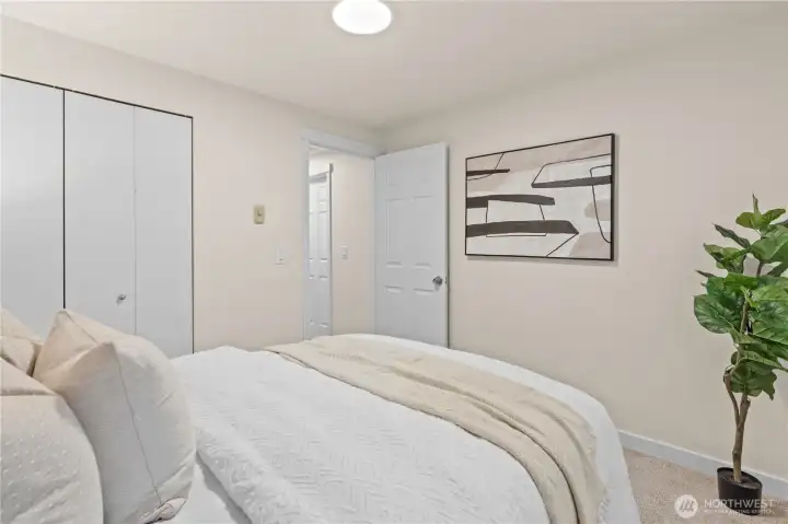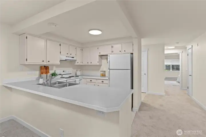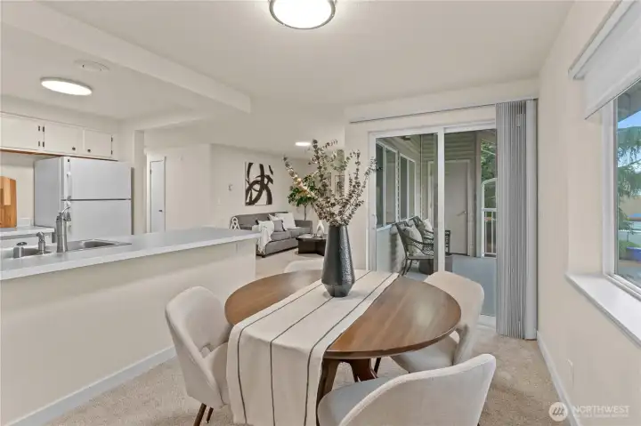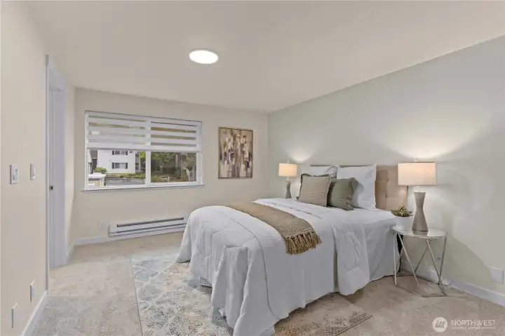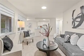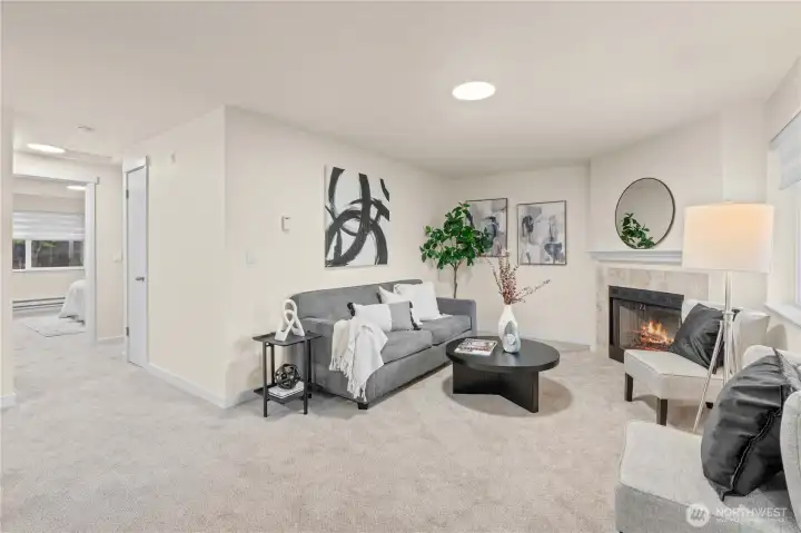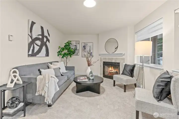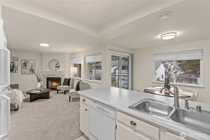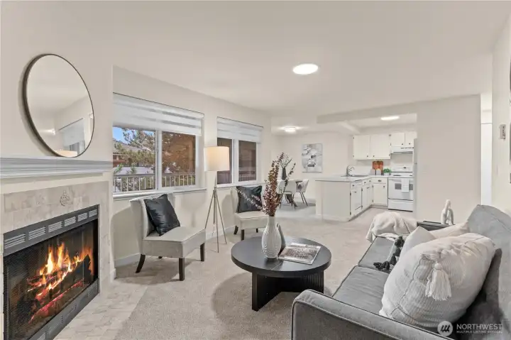 Beautifully maintained Heritage Forest condo boasts a desirable top-floor end-unit location. The inviting living area features a cozy wood-burning fireplace, perfect for relaxing. An open-concept layout seamlessly connects the living, dining, and kitchen areas—ideal for both everyday living and entertaining. A sliding glass door opens to a private covered deck with an additional storage closet. The spacious primary suite includes a walk-in closet and full bath. A versatile 2nd bedroom makes an ideal guest room or home office. Recently updated and move-in ready. Enjoy the convenience of a dedicated parking space. Prime Renton Highlands location close to parks, shopping, dining, and easy commuter access. No rental cap!