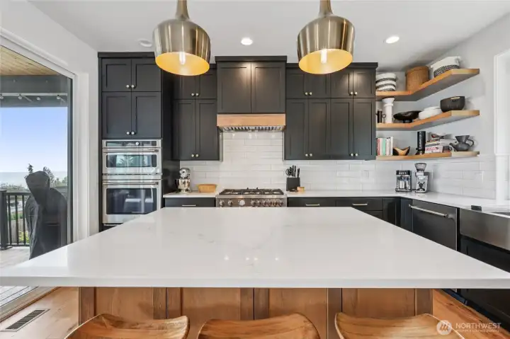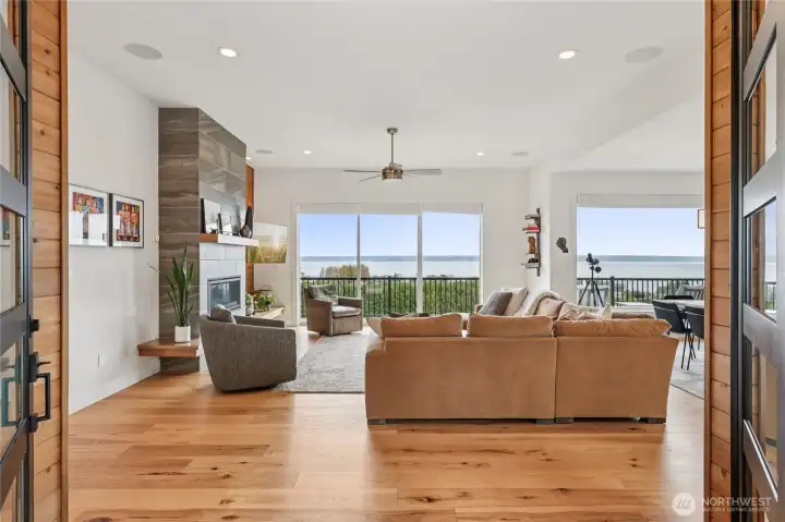 Experience private Camano Island living with sweeping bay, mountain, and territorial views. Ideally located, offering easy access to parks, beaches, and shopping. Main floor living offers custom cabinetry throughout, warm hardwood floors, and chef’s kitchen with double ovens and elegant finishes. Enjoy Northwest outdoor living year-round on the covered view deck. The primary suite captures views from every angle and features a large walk-in closet, en suite bath with a soaking tub, an oversized shower, and private deck access. Lots of space to entertain either floor! Two garages (one on each level) + a 300+sqft flex room w/space for gym, studio, or storage. Generator wiring and EV charging make this home as functional as it is beautiful.