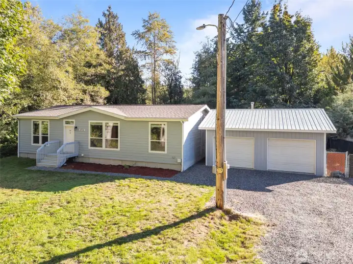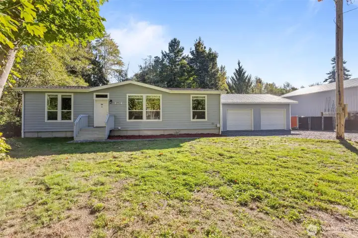 Tucked away down a quiet dead end street just minutes from Lake Goodwin, enjoy this 2021 Schult built home that offers the perfect blend of comfort and charm. Imagine mornings with coffee on the back porch, evenings by the fire of your 1.41 acre private lot, and weekends spent exploring the lake. Inside, you will find 3 bd, 2 ba and an inviting and open layout. A heat pump, all appliances, and Generac generator go with the home to keep you comfortable year round. Outside, there is a fenced backyard, 24x24 garage/shop, covered RV parking with hookups, storage shed, and plenty of space to garden or unwind. This is a home where living feels just right!