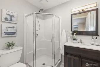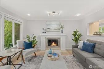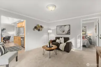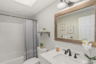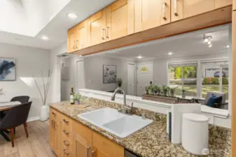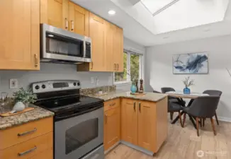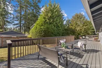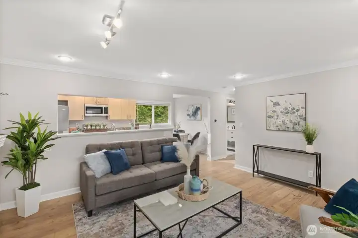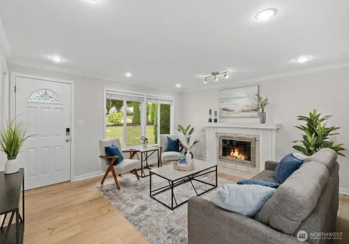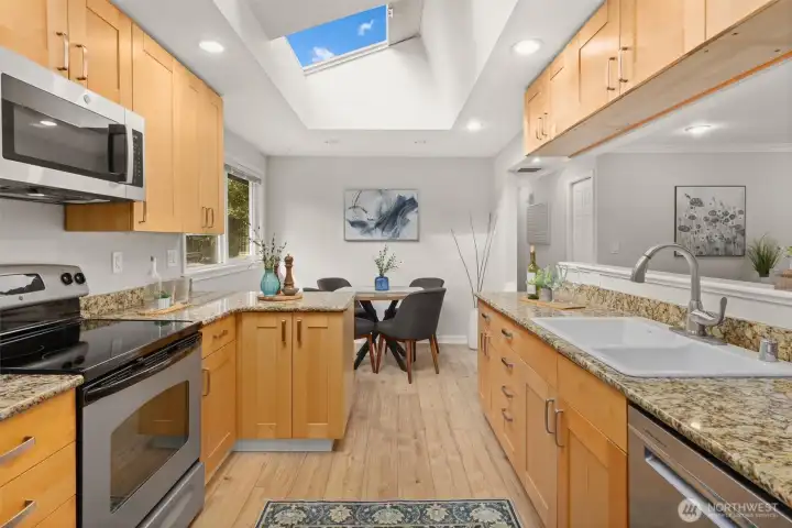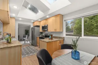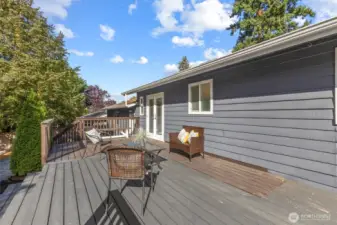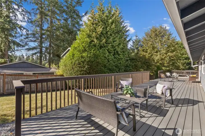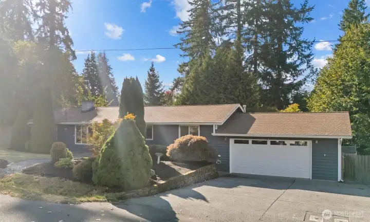 Tastefully updated rambler sits comfortably on a large corner lot in the coveted Northshore School District. New floors & paint throughout this turn-key home. Natural light floods through over-sized skylights & windows creating a light & bright great-room. Granite countertops & SS appliances compliment shaker cabinets in this open-concept, galley kitchen. Living room w/ cozy, gas fireplace & additional family room offer versatile gathering space for all. Down the hall leads to primary bedroom with en-suite bath & a full bath serving the additional bedrooms. An extra room offers space for work from home, guest room, or additional bedroom. Huge, newly refinished deck leads to meticulous landscape w/ mature trees for private outdoor living.