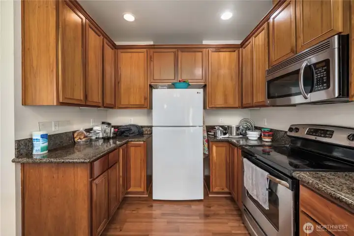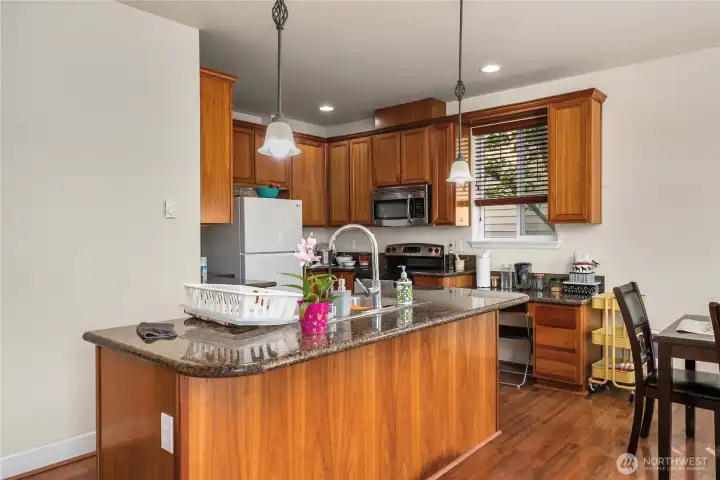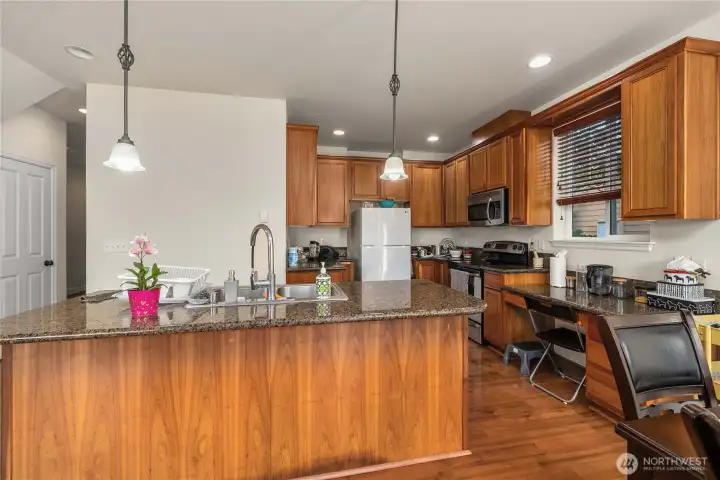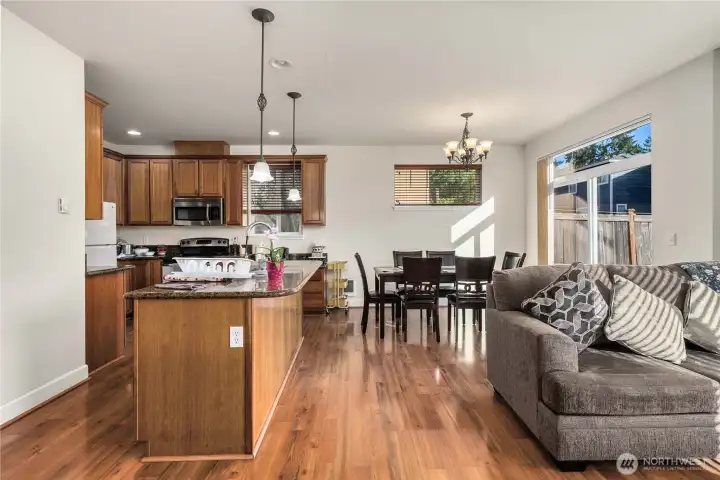 Welcome to this beautiful end-unit townhouse in the desirable Maplewood Grove gated community! This two-story home features 3 bedrooms, 2.5 bathrooms and 1,849 sq. ft. of comfortable living space. The open-concept layout offers a spacious and inviting atmosphere with vaulted ceilings, a large kitchen with granite countertops and a breakfast island, and laminate flooring throughout the main level. The bright living and dining area includes a large sliding door that opens to the back patio and a fully fenced backyard. All appliances are included. The attached 2-car garage offers convenience and extra storage. Ideally located close to freeways, Kent Station, shopping, dining, parks, and public transit. Must see!