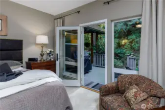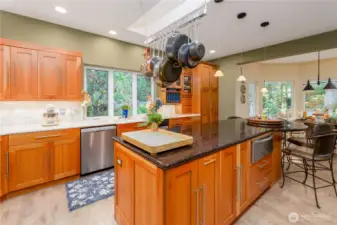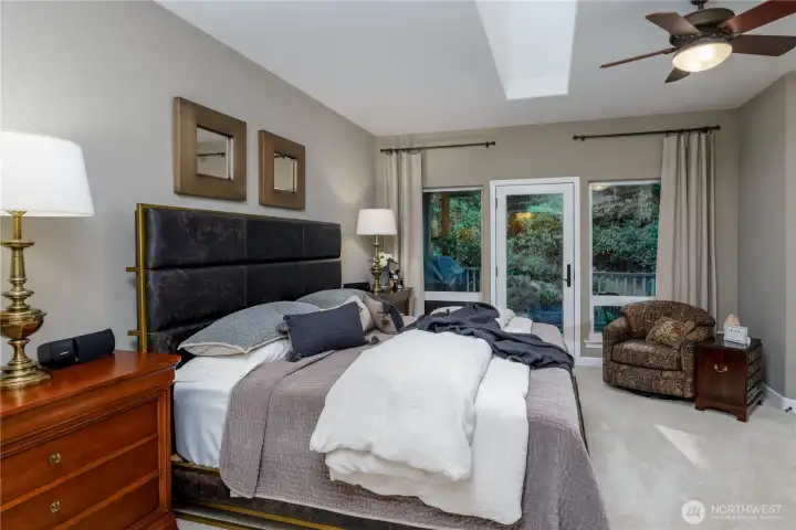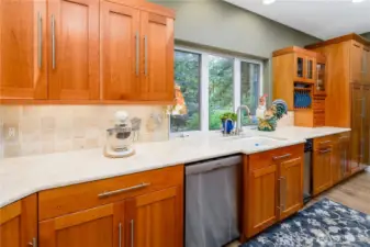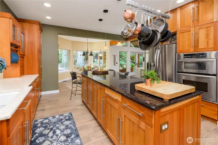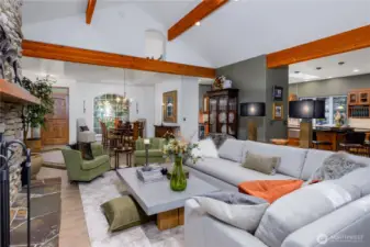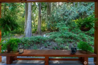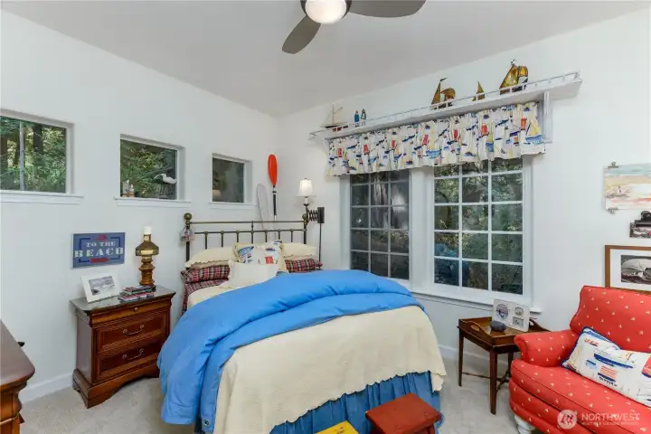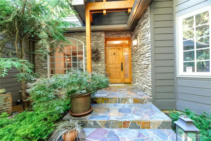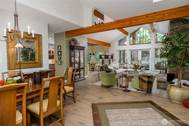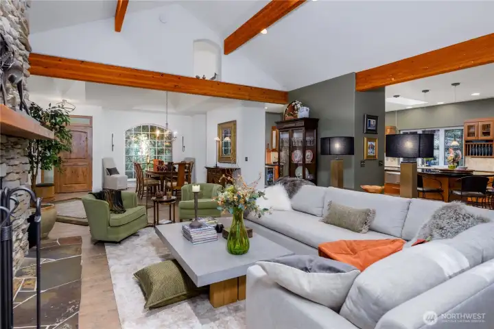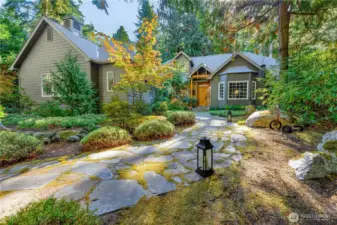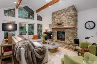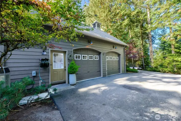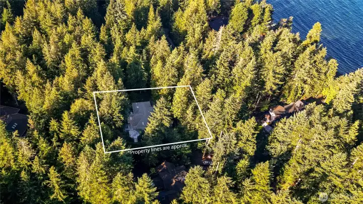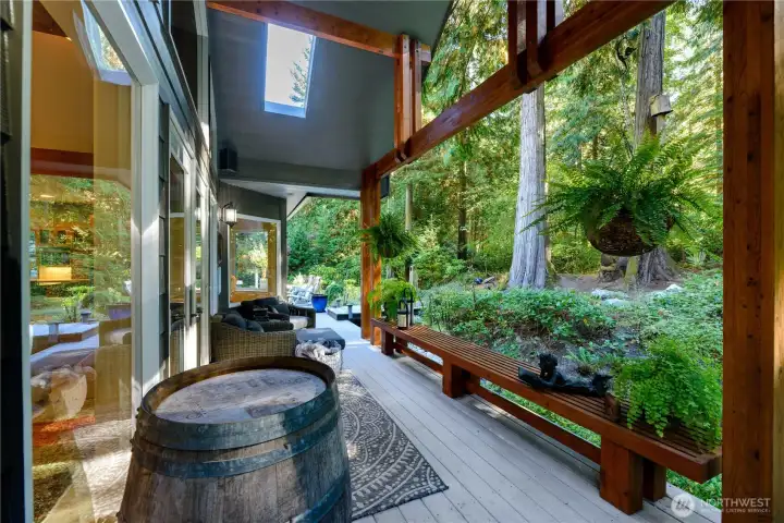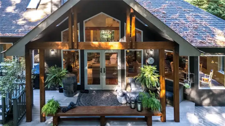 Rare combination of beauty, quality, style & privacy that has to be seen to appreciate. Tucked in the trees on the Miller Peninsula sits this absolute gem of a property that is just a short walk to the Panorama Vista park with epic views of the Strait. Enter the home along a charmed slate pathway & note the copper accent roof over the library window. The great room is spectacular with towering beamed ceilings & a gorgeous fireplace with a wall of windows that looks out to your own green forest. The dream kitchen offers a huge island w/granite counters, cherry cabinets, 4 burner stove, warming drawer, and pot rack. All new: paint, heat pump, extra insulation in attic, new LVP floors, high end carpets in library and bedrooms, water softener.