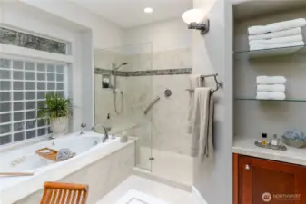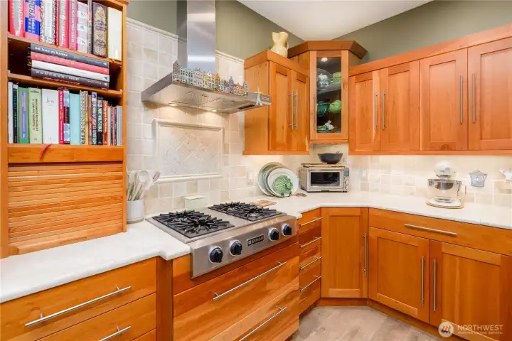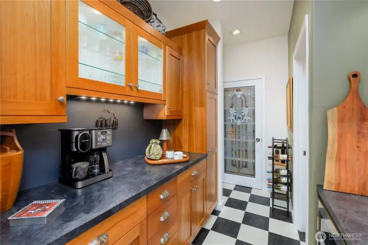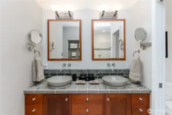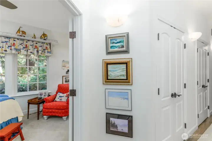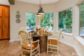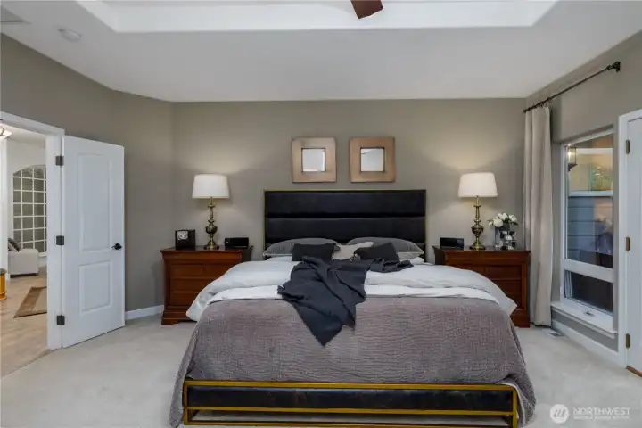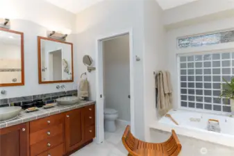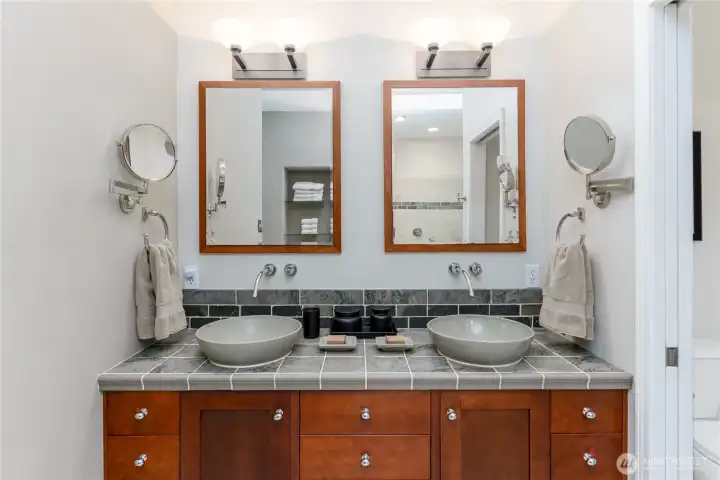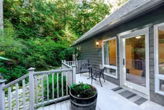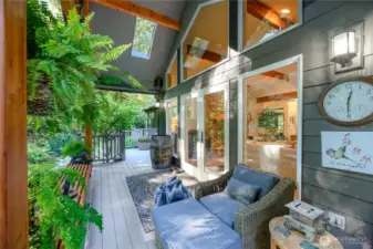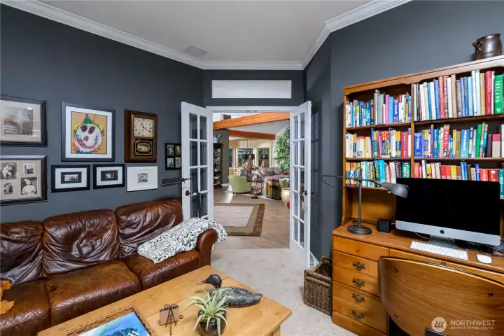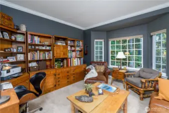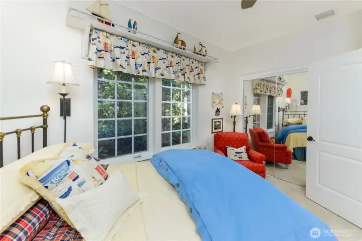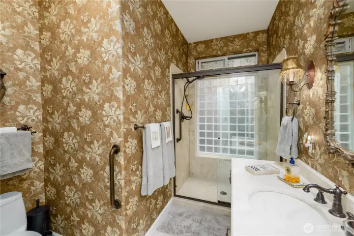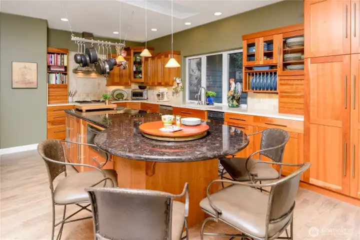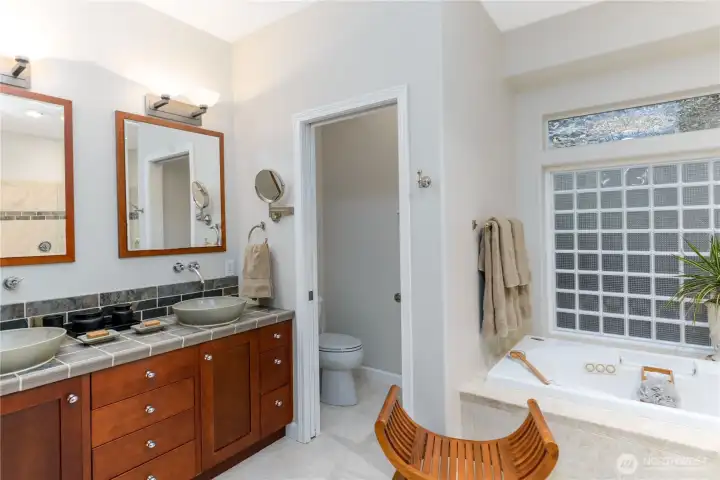 Rare combination of beauty, quality, style & privacy that has to be seen to appreciate. Tucked in the trees on the Miller Peninsula sits this absolute gem of a property that is just a short walk to the Panorama Vista park with epic views of the Strait. Enter the home along a charmed slate pathway & note the copper accent roof over the library window. The great room is spectacular with towering beamed ceilings & a gorgeous fireplace with a wall of windows that looks out to your own green forest. The dream kitchen offers a huge island w/granite counters, cherry cabinets, 4 burner stove, warming drawer, and pot rack. All new: paint, heat pump, extra insulation in attic, new LVP floors, high end carpets in library and bedrooms, water softener.
