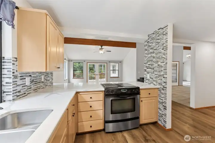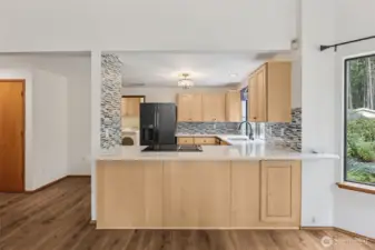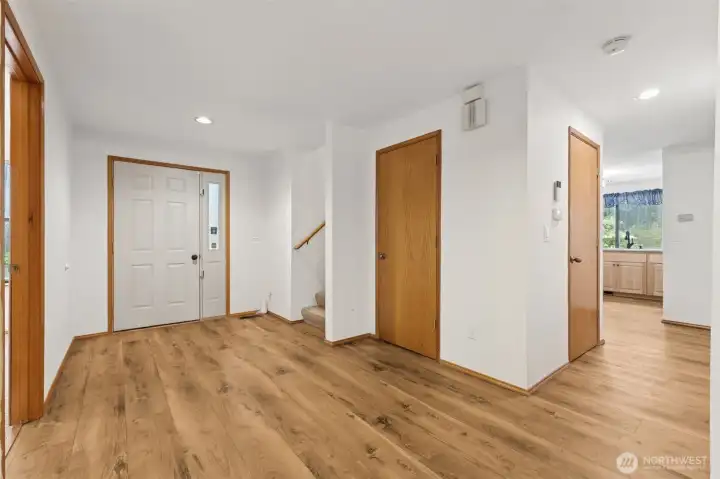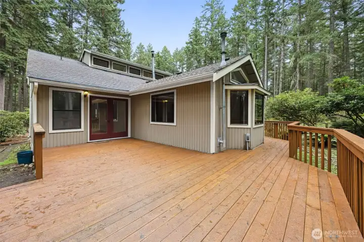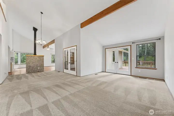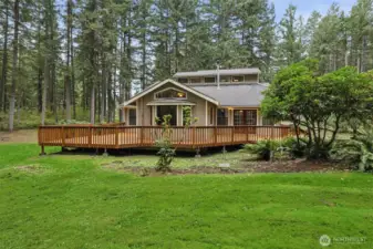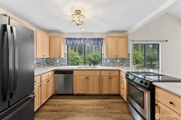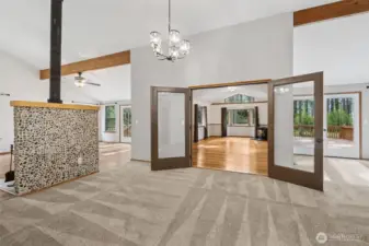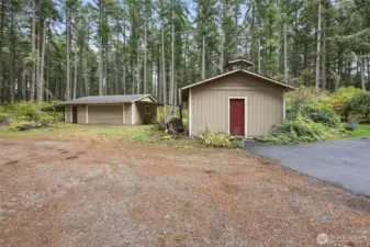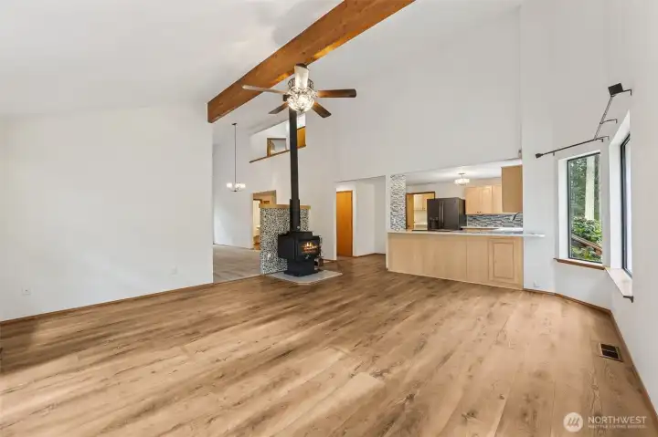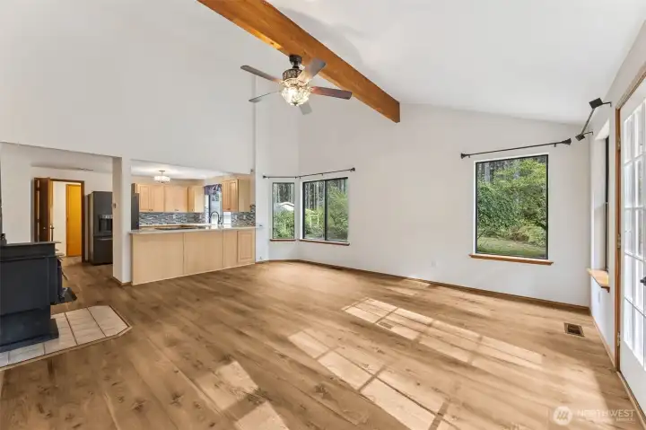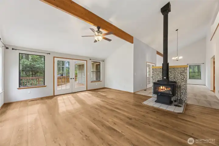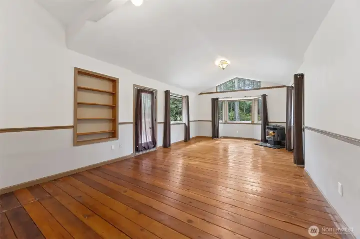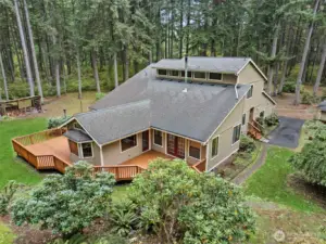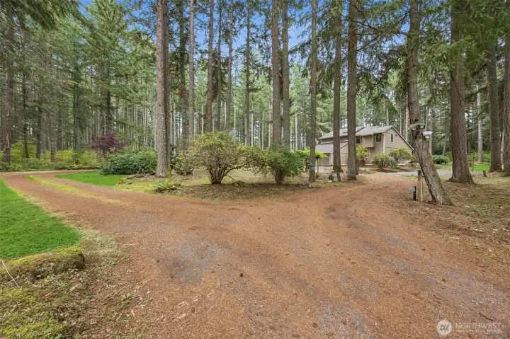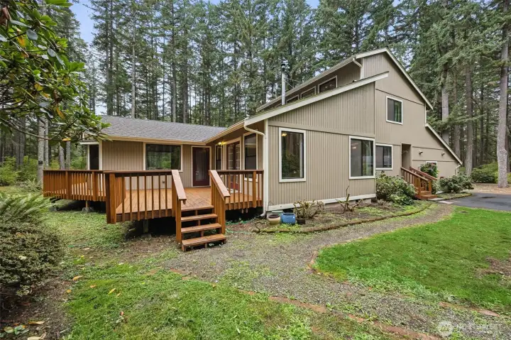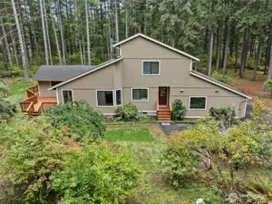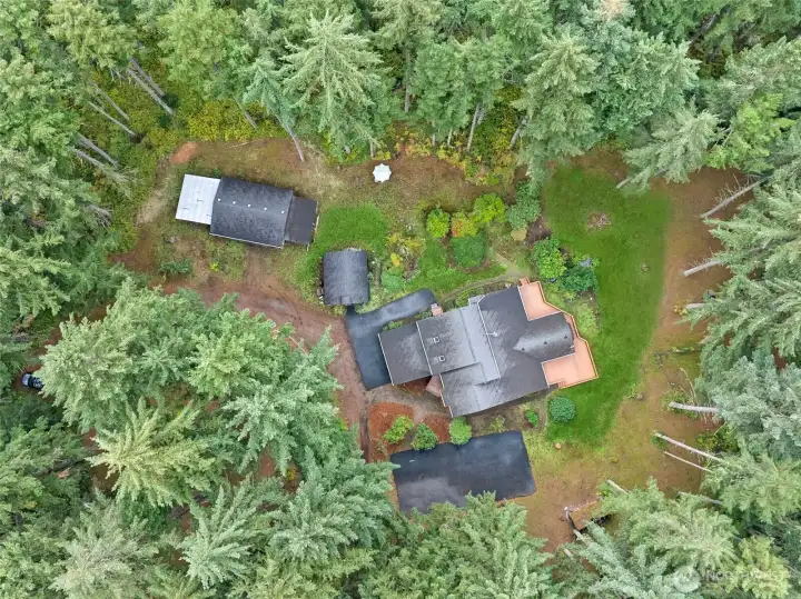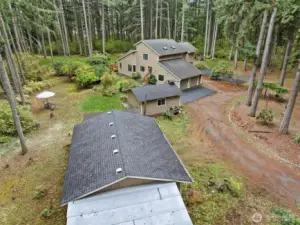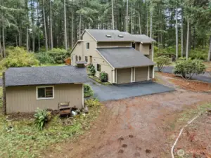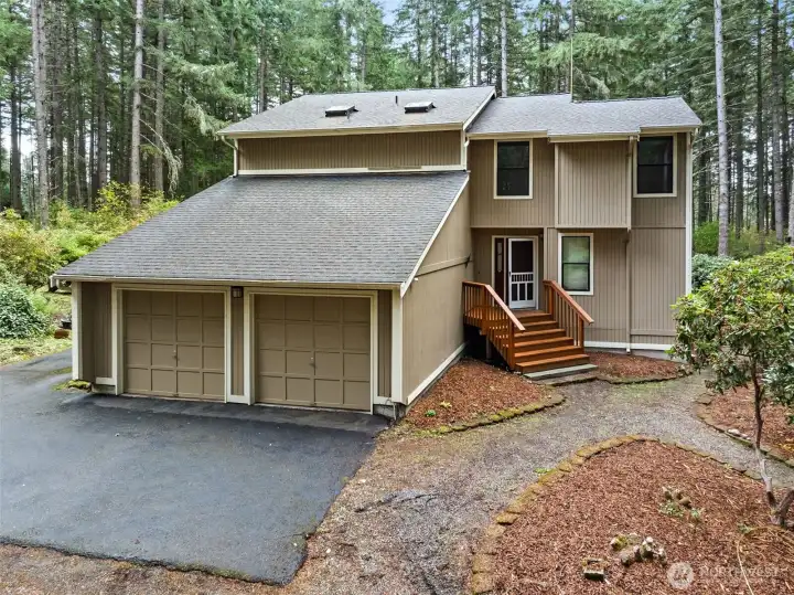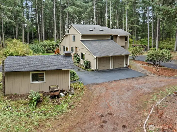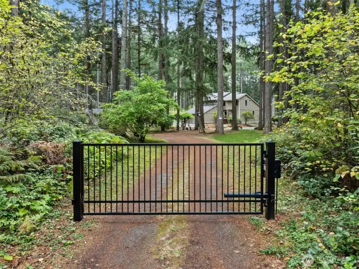 Beautifully updated home on private 2.5 acre lot W/gated entry & NO HOA! Step inside to find NEW LVP floors + fresh interior paint! Main floor W/bedroom & ¾ bath + formal living & dining rooms W/vaulted ceilings. Cozy living room W/exposed beam & wood-burning FP + spacious bonus room W/hardwood floors & pellet stove. Remodeled kitchen W/resurfaced cabinets, quartz counters, SS appliances, full-height glass tile backsplash & pantry. Upstairs, the primary suite ft. vaulted ceiling, skylight, WI closet, & full bath. 2nd primary W/dual closets & private bath. Laundry room W/ W/D, home wired for generator & NEW deck for outdoor entertaining. Attached 2-car garage, detached 2-car garage + shop area, carport, & shed! Inc. 2 tax parcels-0418195089.