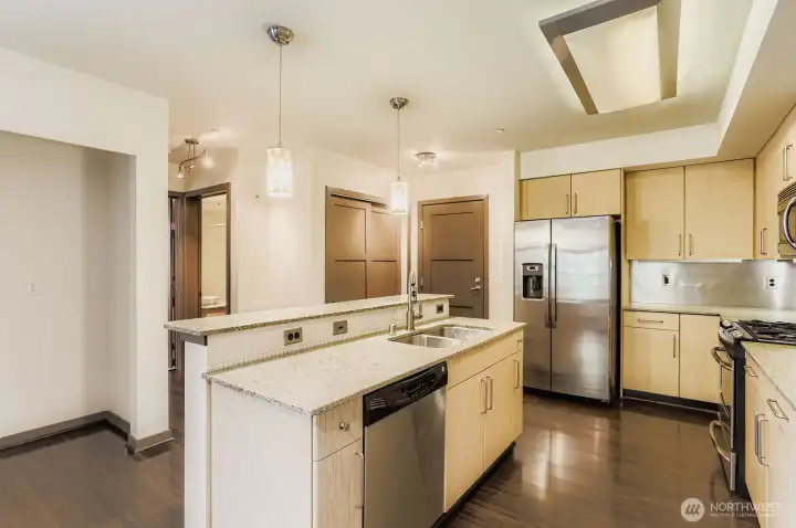 Experience luxury and convenience in this move-in ready condo located in the heart of Green Lake! Unit 207 features a functional, spacious kitchen with stainless steel appliances, gas stove, and breakfast bar—ideal for both cooking and entertaining. The open layout includes easy maintenance flooring, a bright living/dining area, in-unit washer/dryer, and generous storage throughout. The building offers secure entry, a community room, rooftop deck, and garage parking. Just steps to Green Lake, PCC, cafes, shops, and light rail—this location truly has it all. No rental cap and up to 2 pets allowed. Don’t wait—this one won’t last! Future update project fully funded.