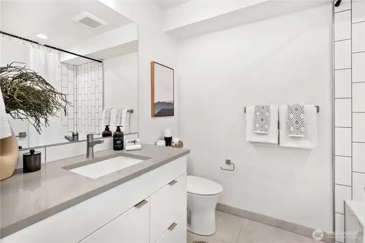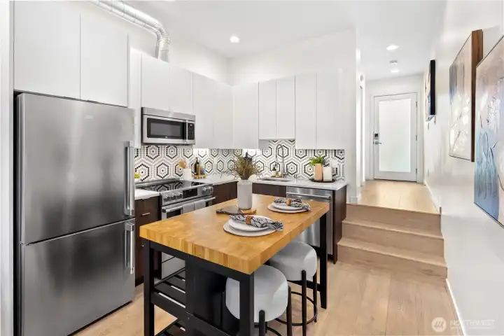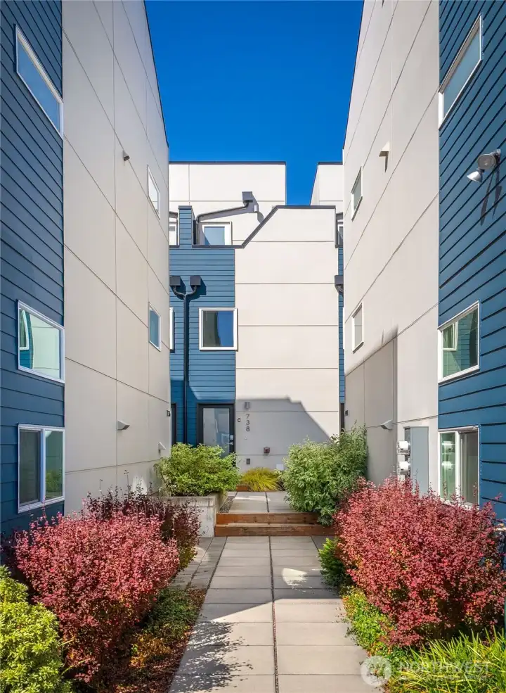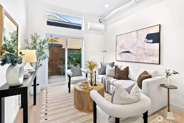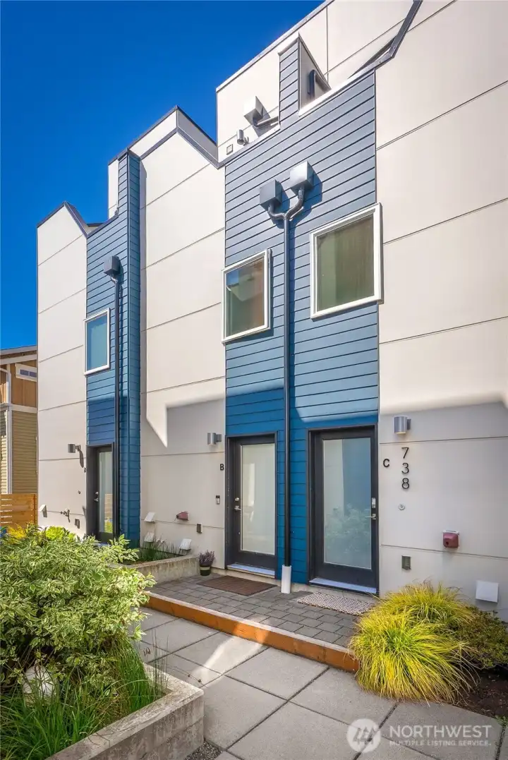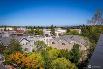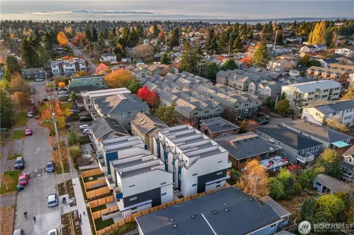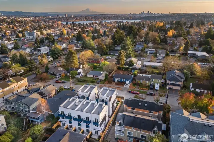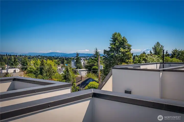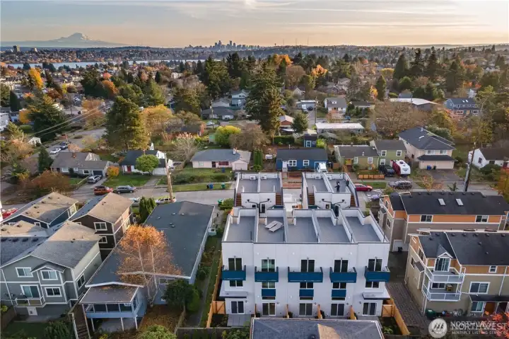 Escape to this chic Greenwood townhome, tucked away for privacy. This light-filled unit lives large with an open floor plan featuring a modern kitchen, breakfast bar, and inviting living area on the main level. Enjoy easy access to a fully fenced patio with a custom-built shed. The upper levels offer spacious bedrooms each with en-suite bathrooms plus a sunny balcony just off the primary. The crown jewel is the rooftop deck with stunning 360° views of the Olympics, downtown skylines, Cascades and Mount Rainier. No HOA. 4-Star Built Green for high energy efficiency and equipped with A/C. Just blocks from Greenwood Park and the shops, restaurants, breweries, and cafes along Greenwood Ave.