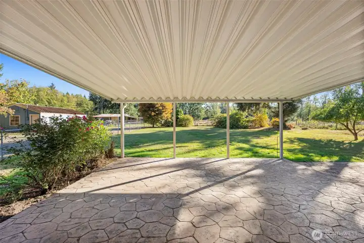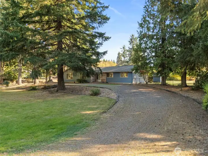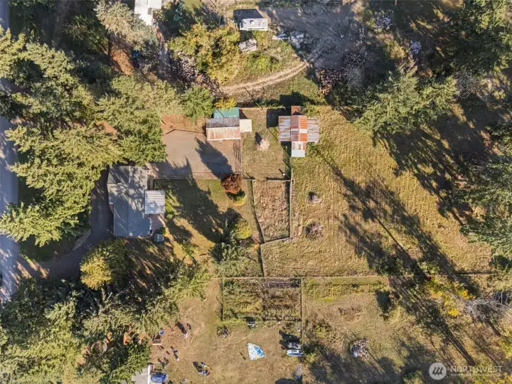Your hobby farm awaits, on 2.46, flat acres, fenced in garden space, fenced in pasture, hayloft (w/power) w/enclosed storage in the back, detached garage/shop w/lien to, once was a quaint home 640 sq ft, own electrical panel=power. A beautiful 628 sg ft covered tile patio (hot tub ready), new roof, newer electrical panel, water/power/RV hookups. Heat pump & wood stove to keep you warm on cold evenings w/AC for the hot summer days. Primary w/slider to breath fresh air. Fruit & mature trees & low maintenance landscaping, pull through drive, room for so much parking. This home was the home to be at, music stages have been on the property to host the most wonderful events. Now its time to pass this home on to a new, can you see this being home?