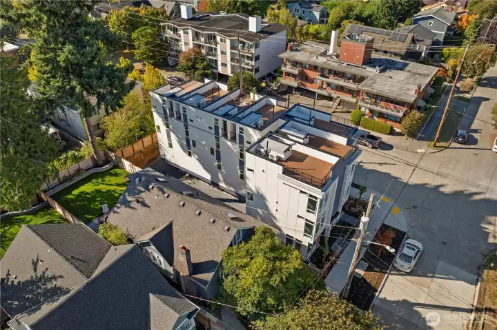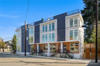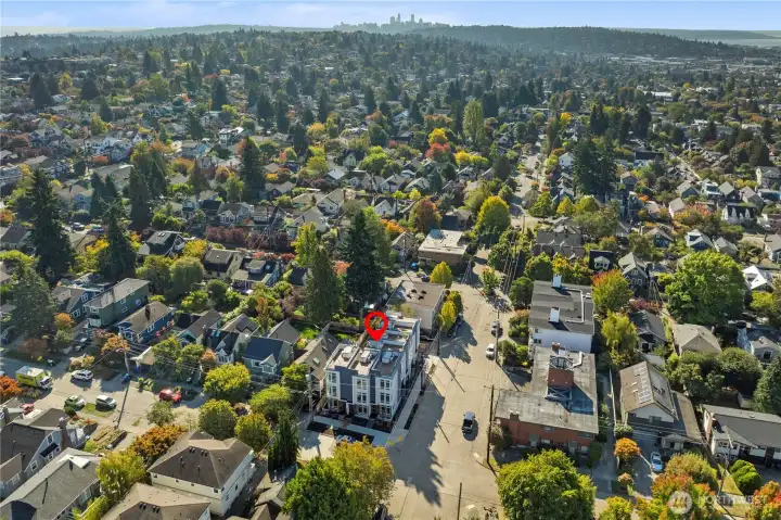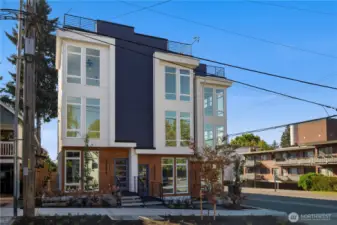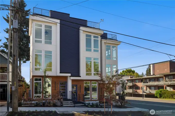 ATTACHED GARAGE INCLUDED! Modern & Luxe New Construction in the Heart of It All. Set across from a quiet park, you’re just blocks to Green Lake, charming cafés, Ballard shops & dining—all with easy transit nearby. Experience the epitome of refined sophistication with designer touches throughout—porcelain floors, ambient underlighting & matte black hardware. The open concept living room features a showstopper accent wall & flows seamlessly into a chef-inspired kitchen w/premium SS appliances, quartz countertops & custom cabinetry. Upstairs, retreat to your chic top-floor primary suite w/a spa-like bath alongside a spacious 2nd bedroom & full bath. Cap it all off w/a private rooftop deck w/sweeping views—perfect for relaxing under the stars!