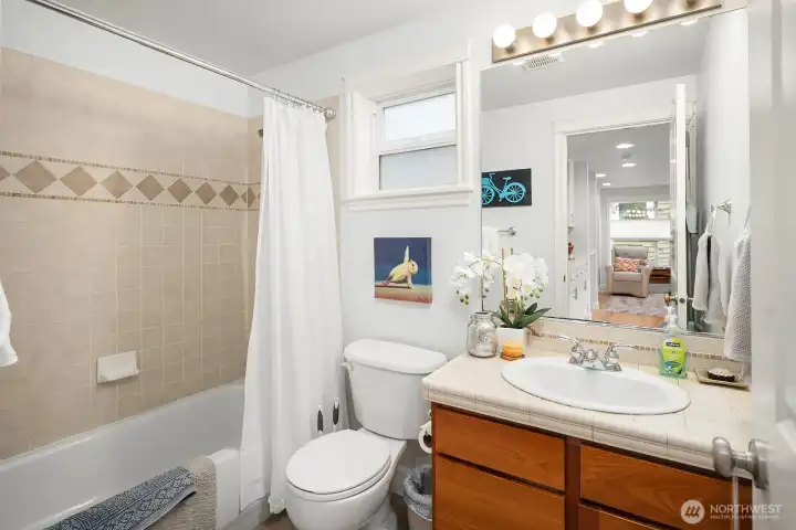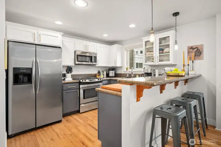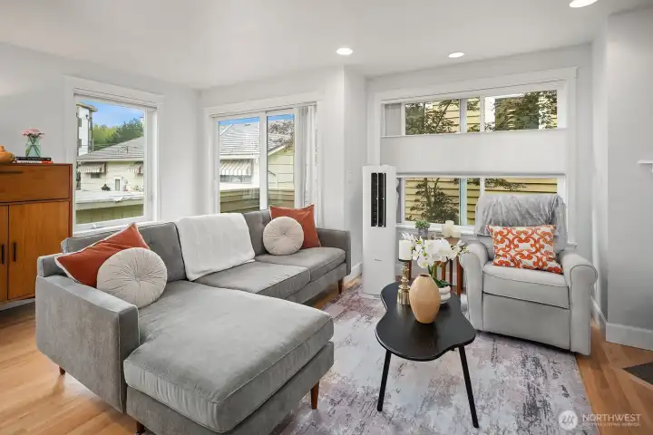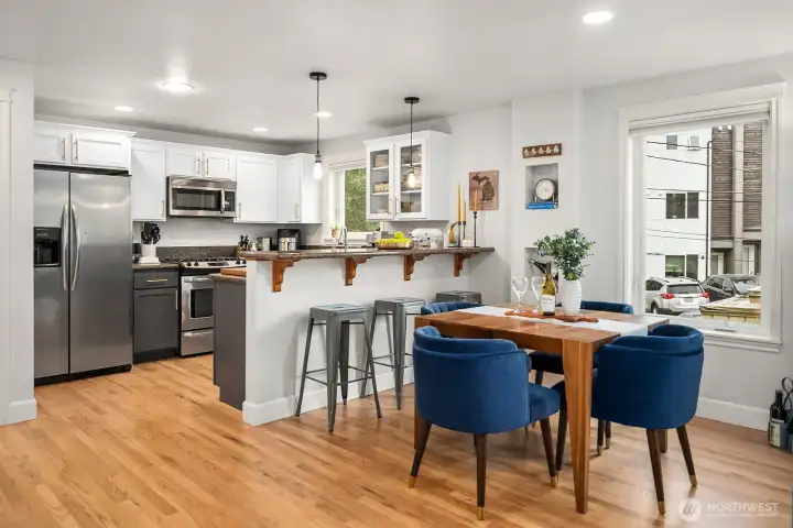 Live just steps from Greenwood’s vibrant restaurants and shops in this bright and inviting 3-bedroom, 2-bath end-unit townhome. A thoughtfully designed layout showcases hardwood floors, beautifully updated baths, and an entry-level guest bedroom with patio access. The main level features a gourmet kitchen with stainless steel appliances, generous storage, and seamless flow into a spacious living and dining area that opens to a sunny deck, ideal for morning coffee or entertaining. Upstairs, two vaulted bedrooms share a Jack & Jill full bath, while a convenient laundry room completes the level. With no HOA dues and easy access to local parks and transit, this home combines modern updates with everyday convenience in a prime location.