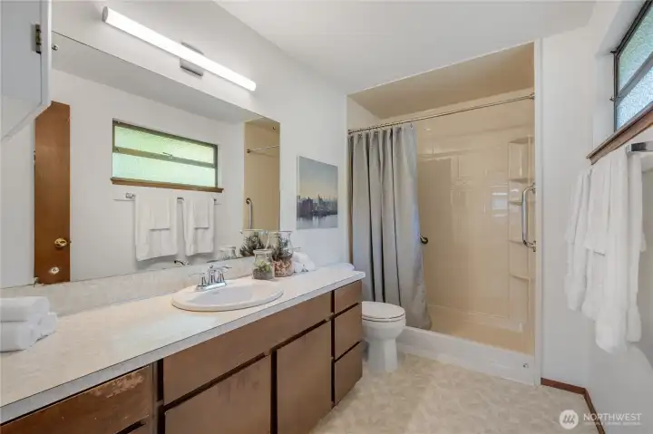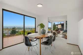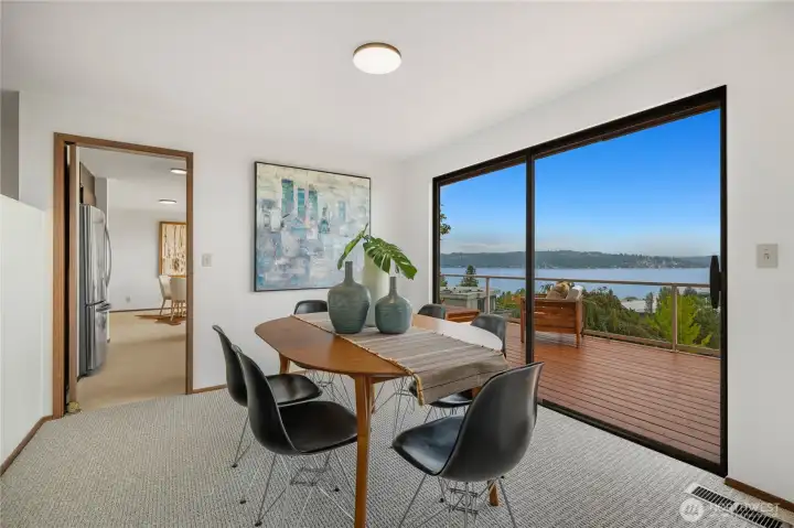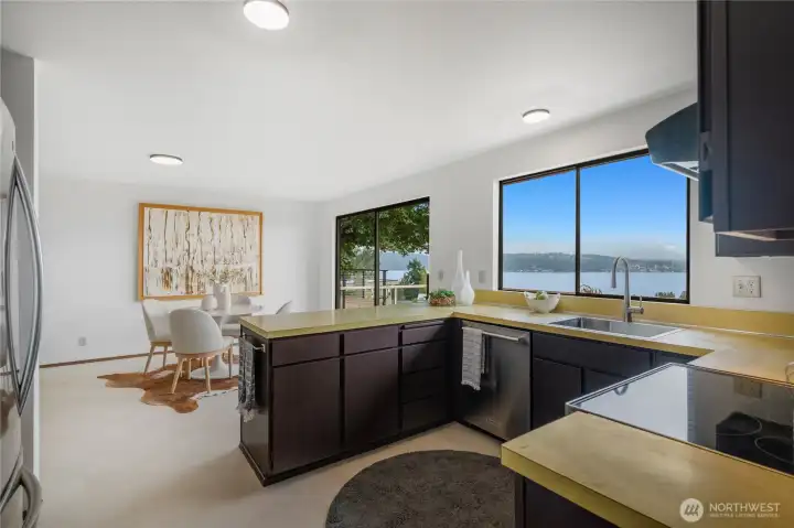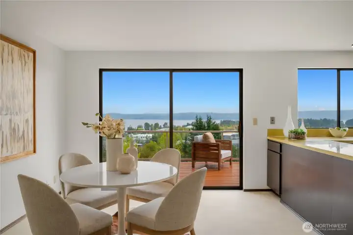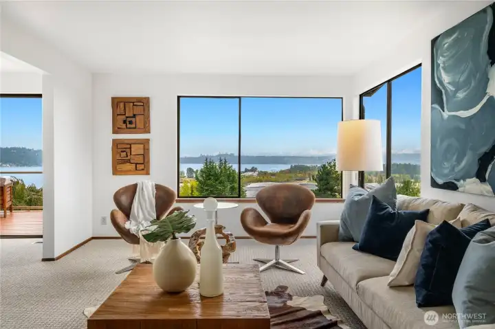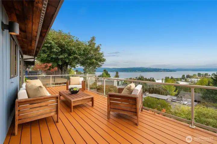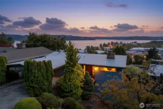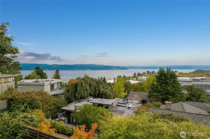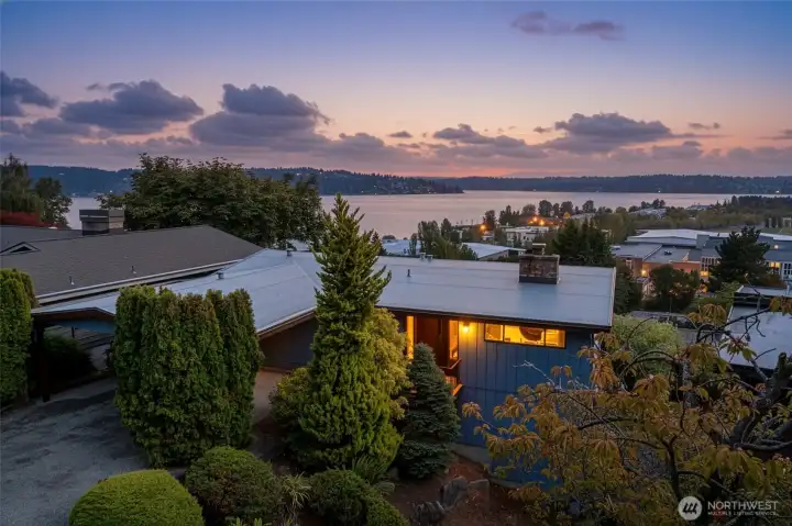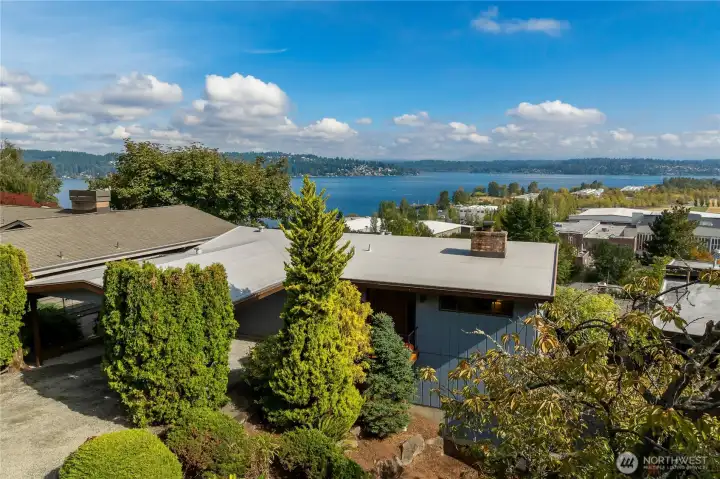Grab a front row seat to the splendor of the Northwest! Generous windows embrace the main living areas of this 1968 custom home, filling the rooms with light. Wake to striking panoramic sunrise views over the lake and to the mountains, watch the seasons take hold, the glow of autumn paint the trees, and bright clouds roll across the sky. The open flow provides ample space for dinners and kitchen dance parties, for work and workouts, and a flexible footprint in which to shape the home of your dreams. The main floor primary has a sense of privacy and retreat, with four more bedrooms on the lower level as well as a family room. This home has an active transferrable membership in the View Ridge Swim & Tennis Club located just down the street.