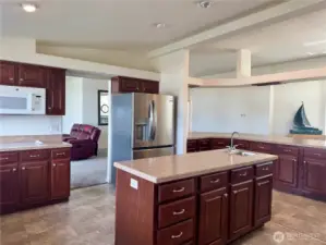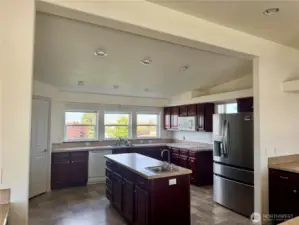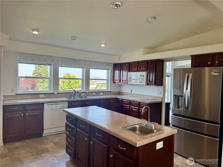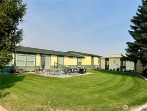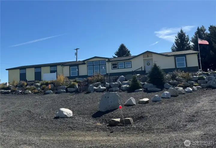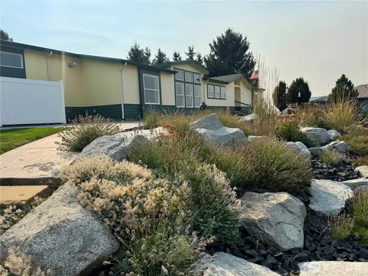 Spacious triple-wide manufactured home with 3 bedrooms, 3 baths, oversized garage, and additional shop space. The bright great room features soaring ceilings and walls of large windows, flooding the space with natural light and creating an open, inviting atmosphere. Kitchen offers a huge bar for seating, perfect for entertaining, and a propane fireplace adds warmth and charm. Expansive primary suite includes ensuite bath. Set on a park-like lot with beautiful landscaping, terraces, and mature plantings, this home combines comfort, style, and functionality with a serene outdoor setting ideal for relaxation and gatherings.
