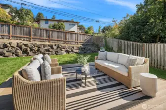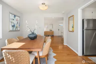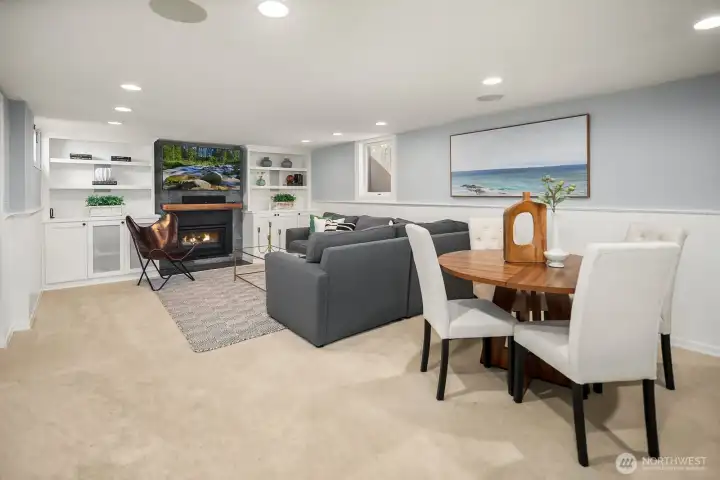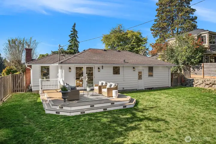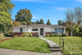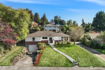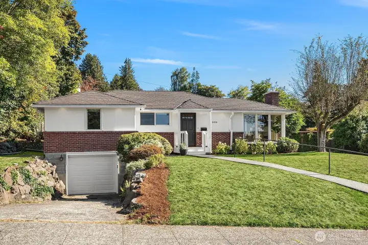Contemporary updates blend w/ mid-century elegance in this Belvedere Terrace home, perfectly situated on an expansive, sun-drenched lot. The living room, bathed in natural light from its floor-to-ceiling windows, is anchored by a marble fireplace & rich hardwood floors. The dining room seamlessly opens to an inviting deck, ideal for entertaining. The kitchen is equipped w/ SS appliances, brushed brass hardware, & Corian countertops. Three generous bedrooms & an updated bath complete the main. The lower level offers a private retreat, including a remodeled family room w/ wet bar, a nonconforming bedroom or office, a second marble bath, a laundry room & a one-car garage. Soak in NE Seattle living w/ territorial views in this ideal location!