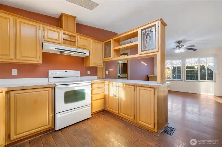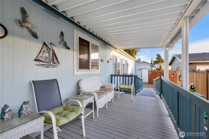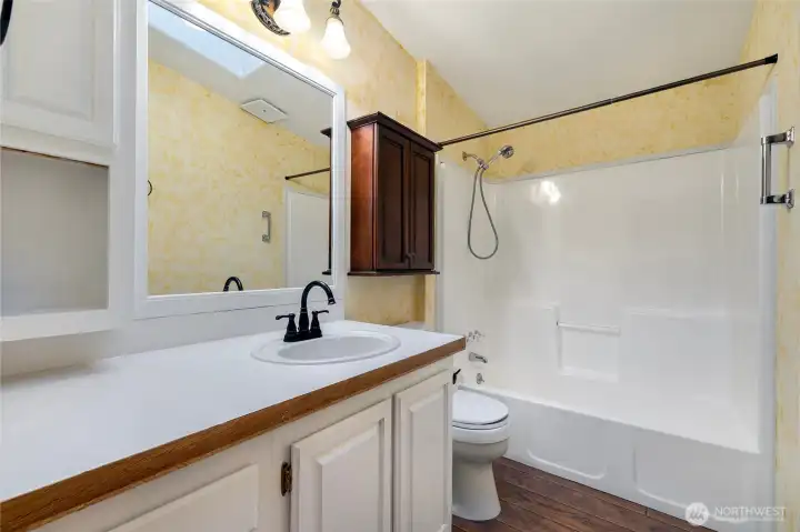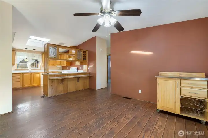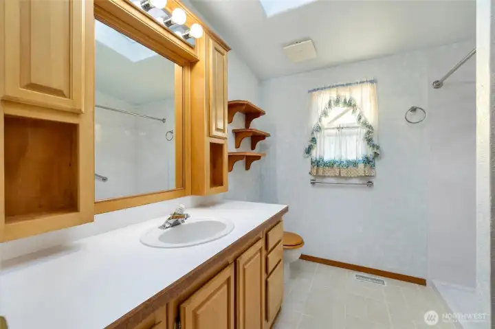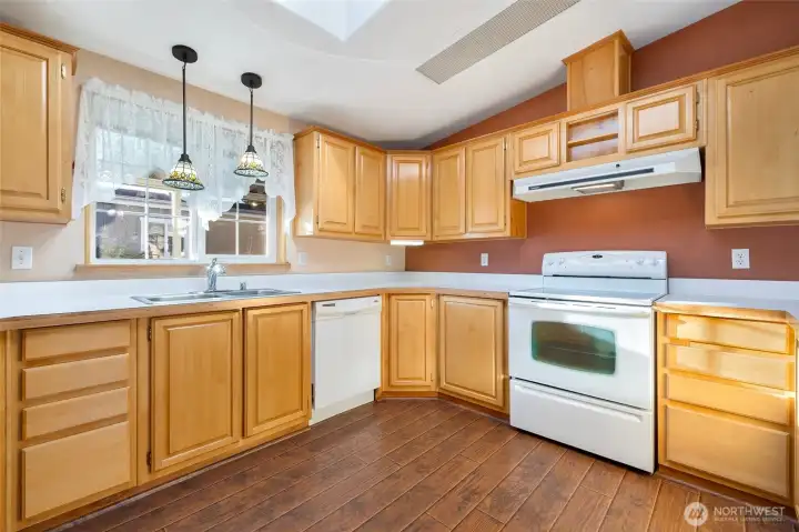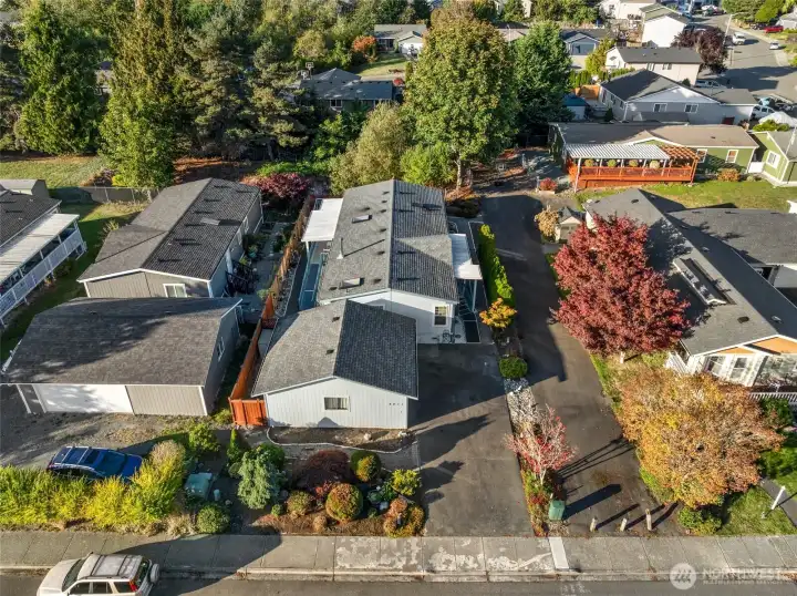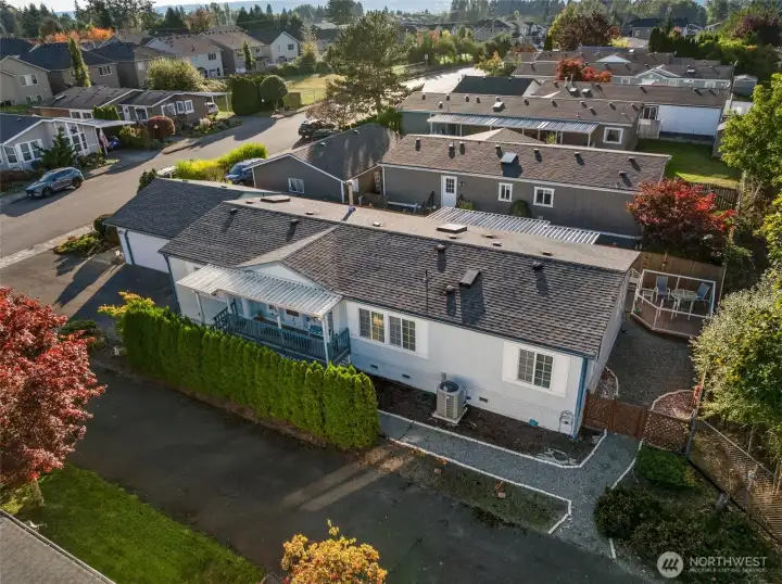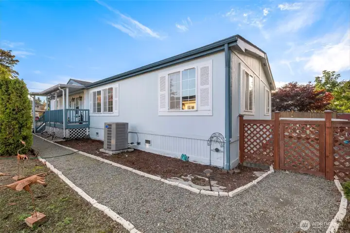 Welcome home to this cute and cozy house! Step into a vaulted ceiling living room with fireplace and lots of natural light. The gorgeous kitchen is complete with breakfast bar and eating nook. Lots of cabinet and counter top space for your cooking needs The primary bedroom is separated away from the other 2 guest bedrooms. Spacious primary bedroom with vaulted ceiling, walk in closet, and shower only bathroom. This property also features a detached garage with auto door opener, 2 decks, and fenced in yard space. The home features skylights for natural light and a heat pump system for heating and cooling. The lot is not leased land!
