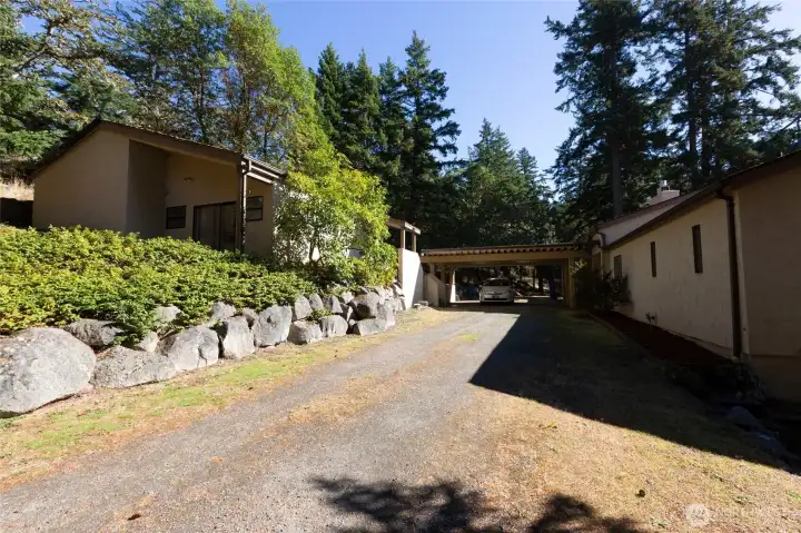 Sunny, private and distant water view home on 4.13 park-like acres perched behind the 48-acre Twin Oaks Farm with graceful southwest pastoral views toward the Alpaca Farm and to Canada. The property borders the 696 acres of National Park including English Camp National Park, Young Hill and miles of hiking and riding trails. Spacious level entry home with lower level, 2944 Sq Ft with open plan, 2 fireplaces, large decks, covered car entry and garage with studio built in 1977 is ready for your personal touches. Includes water storage shed, garden shed and newer whole house generator and heating/ac system. Close to Westcott Bay Oyster Farm, Roche Harbor Resort w/marina, restaurants, groceries, retail, airport, art walk, and trails.
