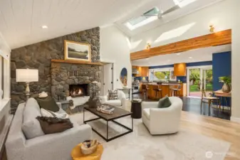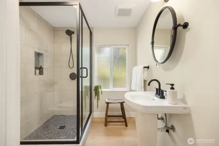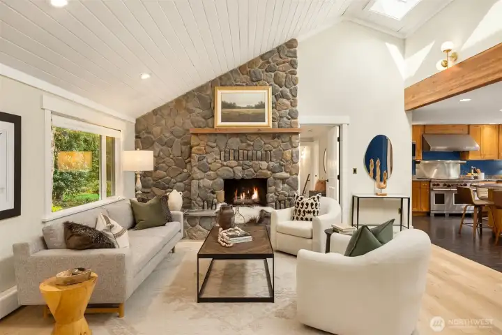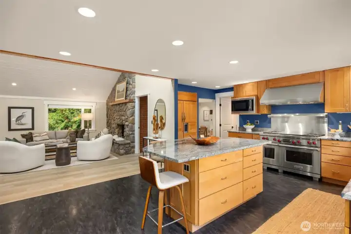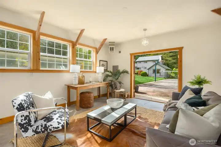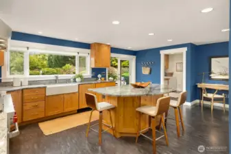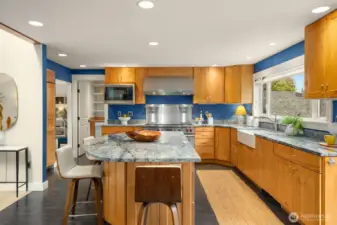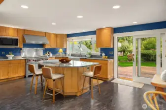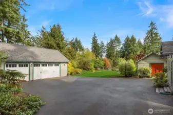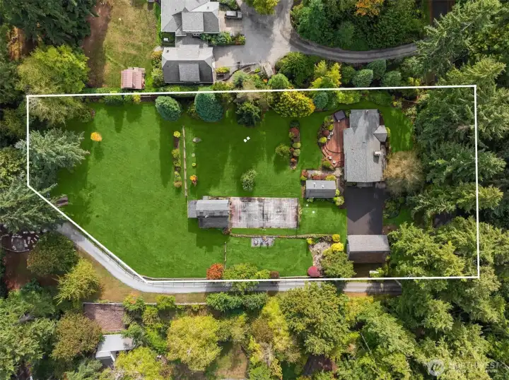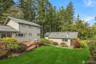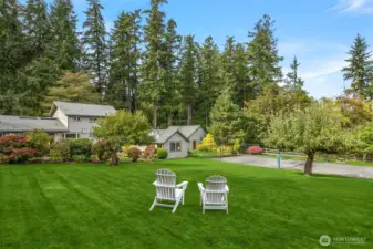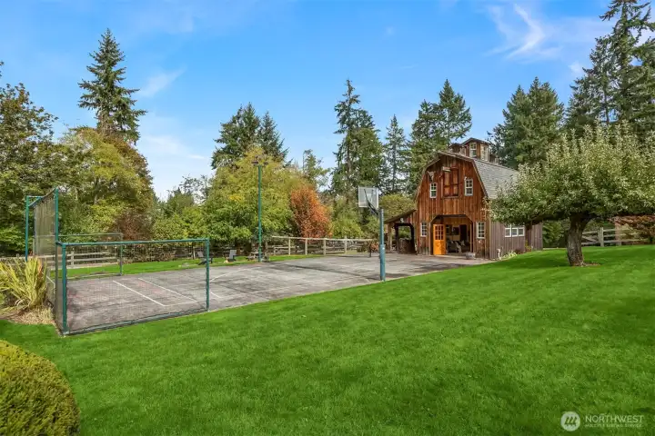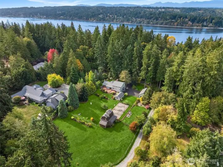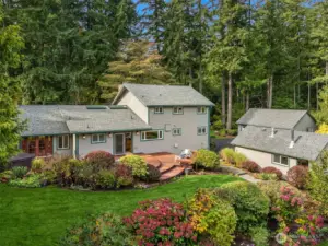 Enjoy quiet sanctuary in this beloved neighborhood in the heart of Bainbridge Island. Beautifully appointed home on 1.66 sunny, level acres. Expansive gardens surround multiple outdoor spaces, including fun sport court, firepit and stunning cottage style barn, an ideal home gym or hobby space. Don't miss the separate studio/office and a 3 car garage. Home features two private primary ensuite bedrooms on main, plus 3 bedrooms and full bath upstairs. Recently remodeled kitchen, granite, stainless appliances; Wolf Stove. Custom Ipe deck, hot tub and generator. Close to water’s edge and Gazzam lake trails. A rare opportunity to enjoy country living with modern convenience and a fabulous property to build memories.