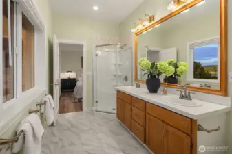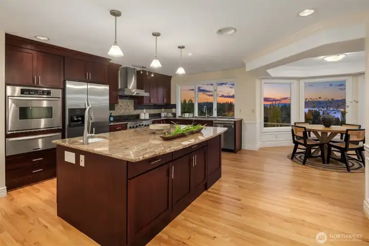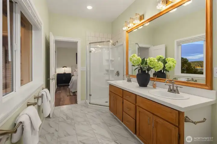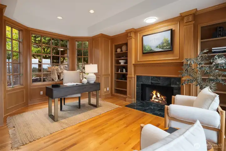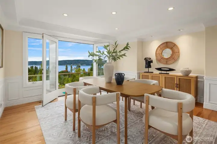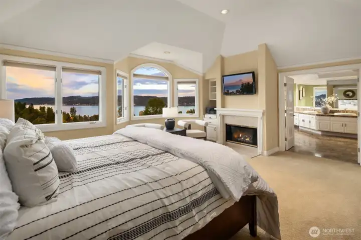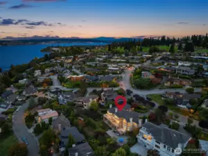 Perched above Lake Washington in highly desirable Inverness neighborhood, this NW contemporary residence showcases stunning panoramic views from nearly every room. Sunlight fills open-concept living spaces through expansive floor-to-ceiling windows & soaring ceilings. Timeless layout flows from elegant living room to formal dining room. Gourmet kitchen opens to spacious family room. Upstairs, luxurious primary suite & additional en-suite bedroom. Lower level offers generous bonus room, 3 view-filled bedrooms & 2 more baths. Extensive millwork & built-ins throughout. Enjoy expansive view decks & low-maintenance private backyard. Dual-zone HVAC, 5 gas fireplaces & 3-car garage. Close to B-G Trail, parks, Seattle Children’s, U Village & UW.