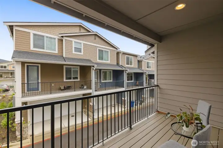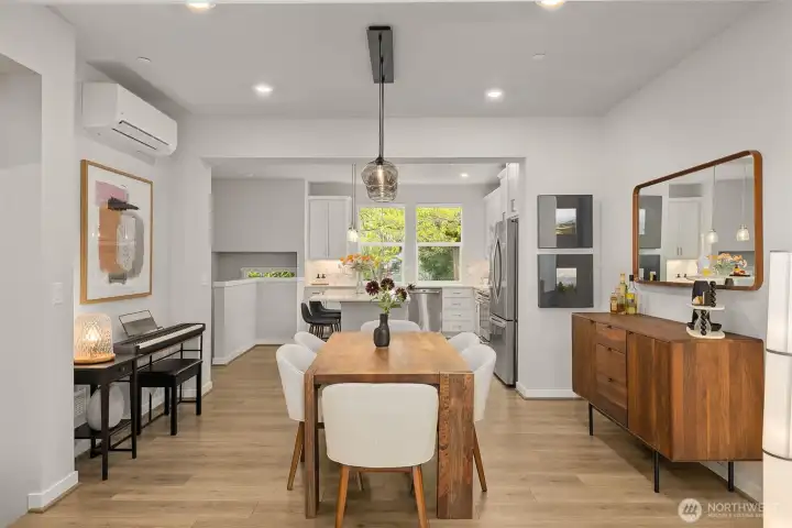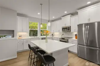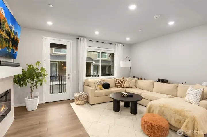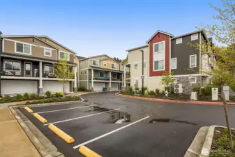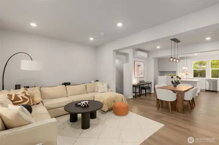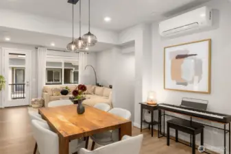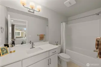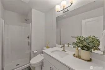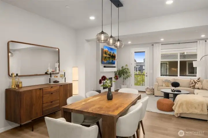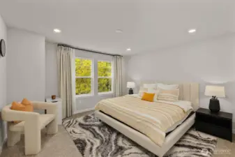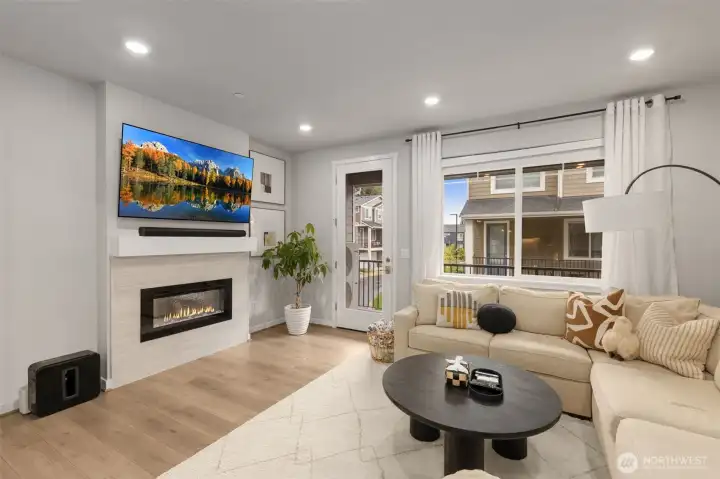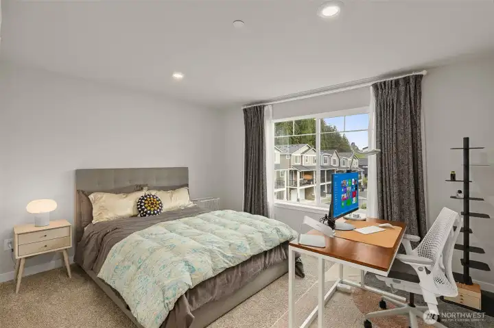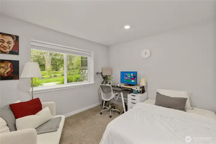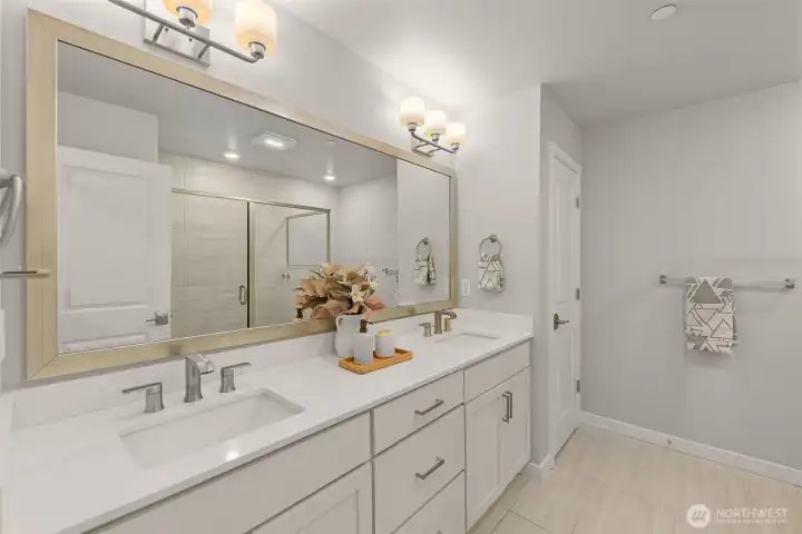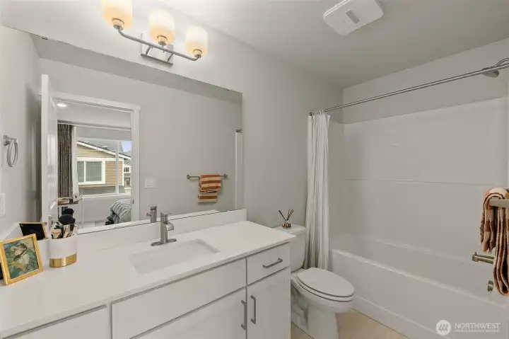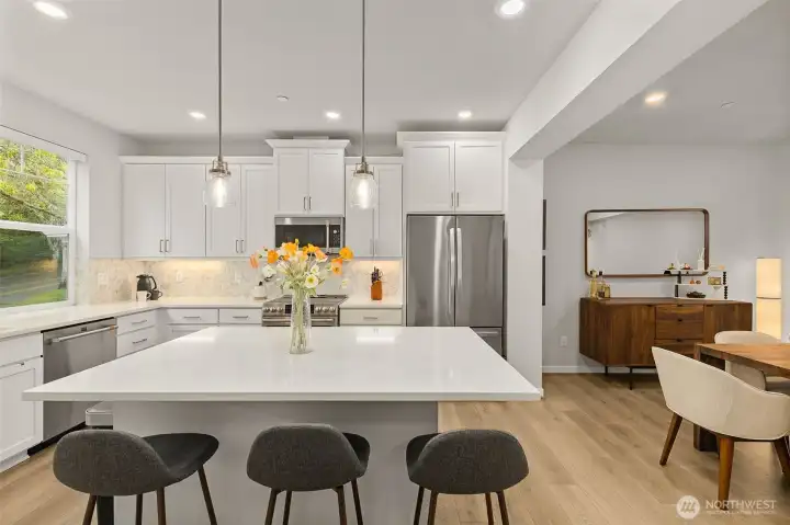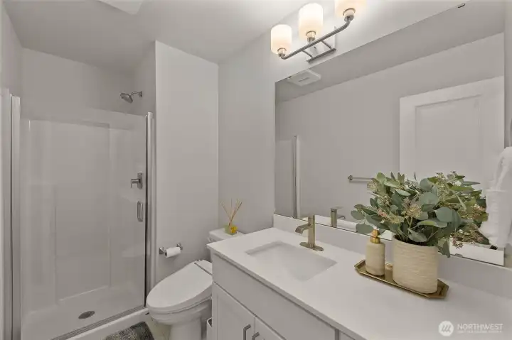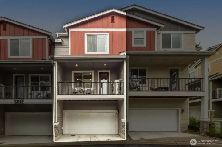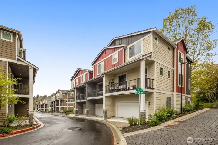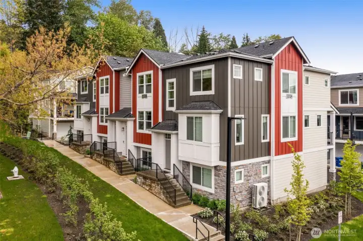 Better than New, Preston North Townhomes is a truly charming neighborhood w/community park & guest parking. This gorgeous private & light-filled 3bedroom home is perfect for entertaining w/large South windows, wood floors, covered deck & a sleek kitchen w/quartz counters, glass tile backsplash, & top-ranked SS appliances. Upper level hosts large owner's suite w/ WIC & dual vanity bath, a secondary bedroom w/ ensuite bath, and conveniently located laundry area. Lower level bdrm offers flexibility as a guest bdrm/media/gym/office to math your lifestyle & daily needs. All this plus A/C, designer curtains, 2 car side by side garage. Northshore schools & set in a great North Creek location near dining, YMCA, I405 & parks. Welcome Home!