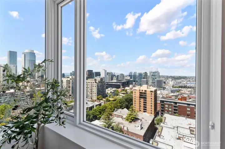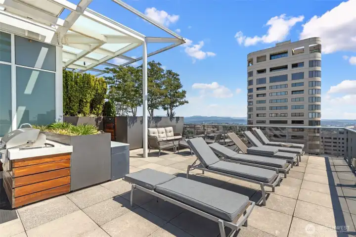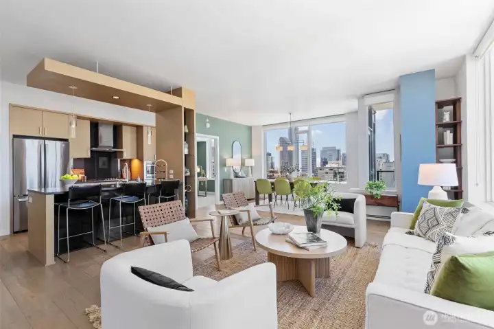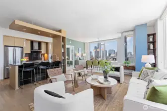 Spectacular northwest-facing condo at the Luma with views of the skyline, Sound, mountains, Space Needle and Lake Union. Large, luxurious living and dining areas with balcony and open, modern kitchen. Serene primary suite with spa-like bath and spacious walk-in closet. Second bedroom with sound and city views doubles as great office. Well-appointed home with high ceilings, tons of natural light, and central A/C. Top-tier amenities include rooftop terrace offering 360-degree city/water/mountain views, large jetted hot tub, lounges and more. Additional amenities include a 24-hr concierge, fitness center, pet lounge & EV charging stations. Luxury highrise living at the finest location: Steps to trendy bars, restaurants, & shops.