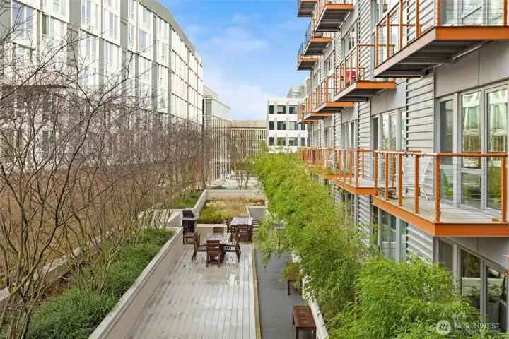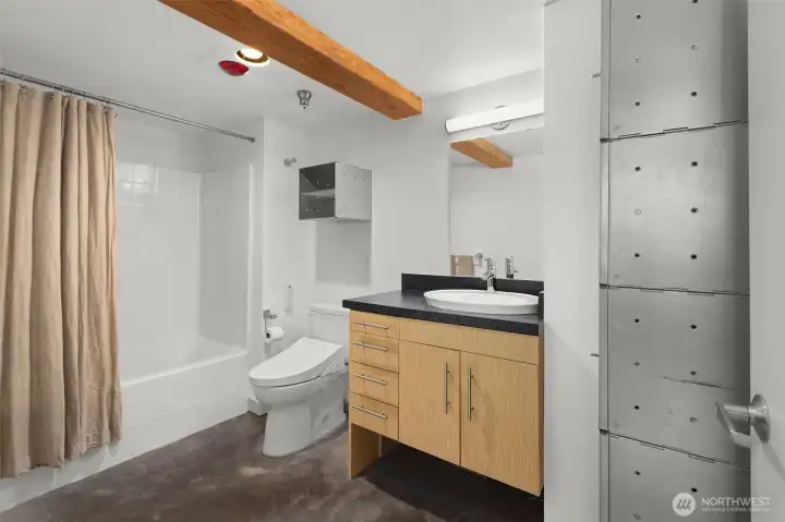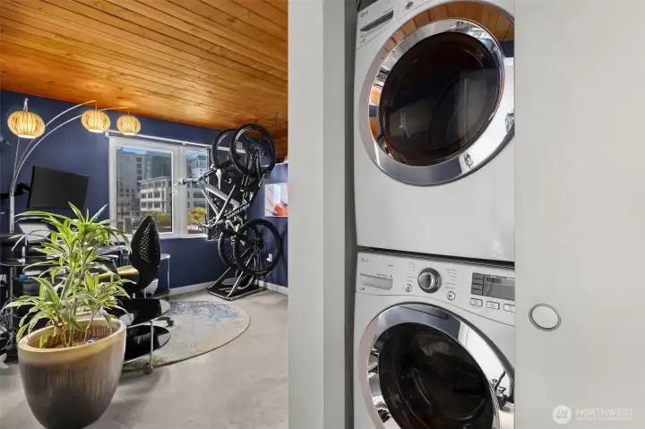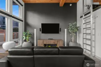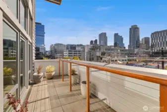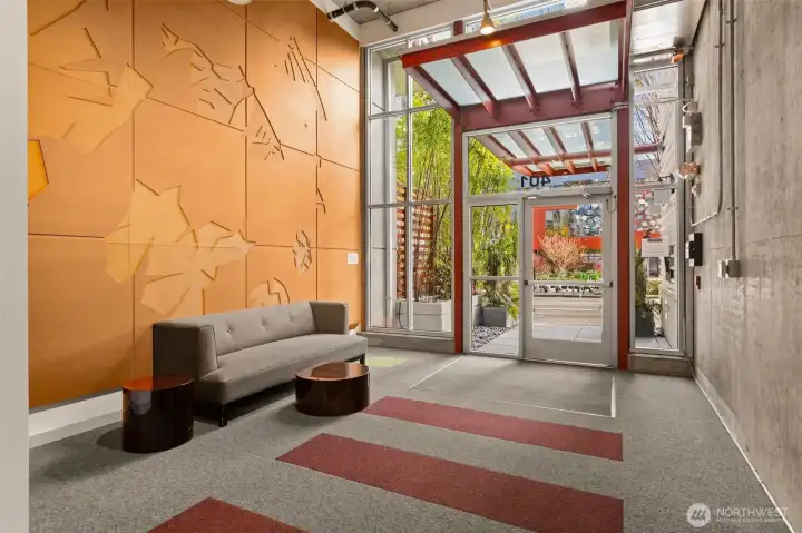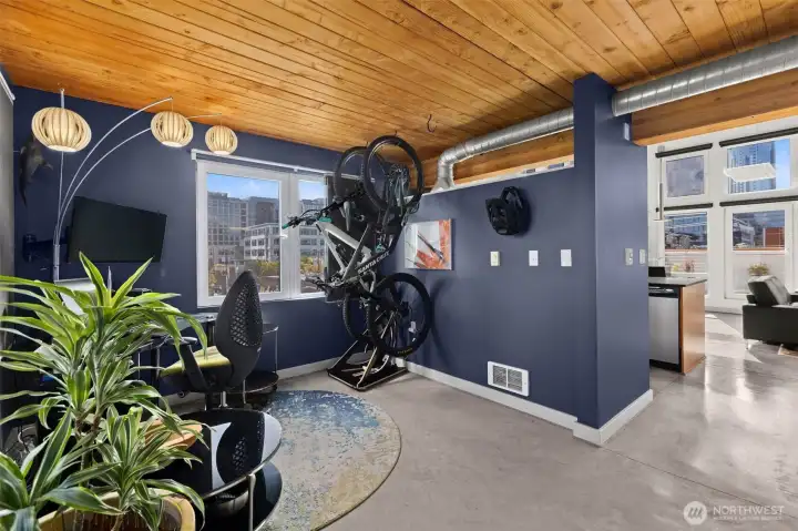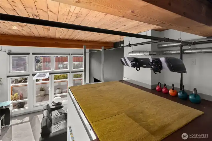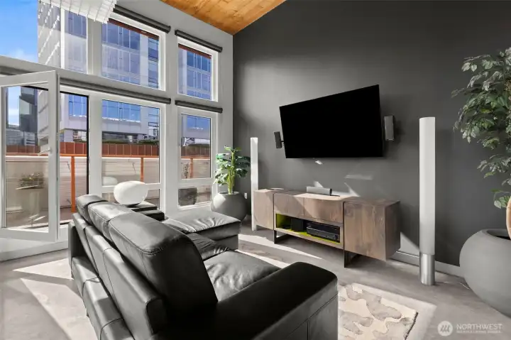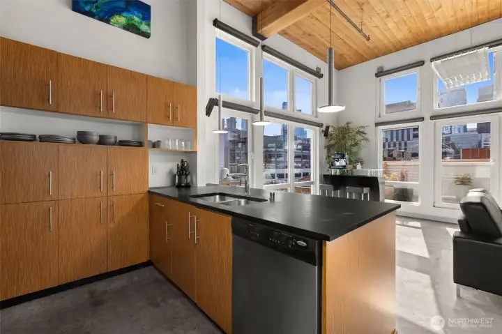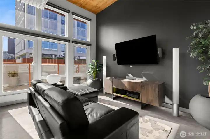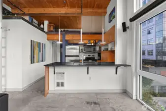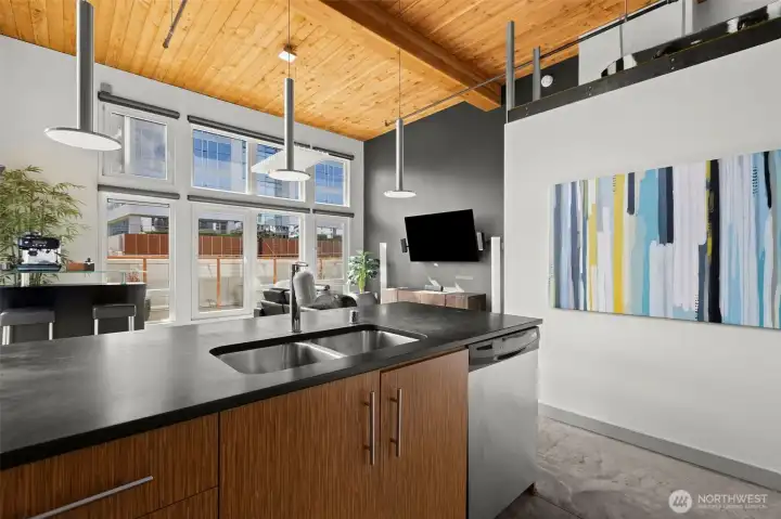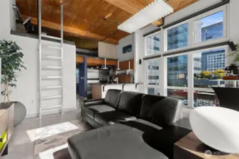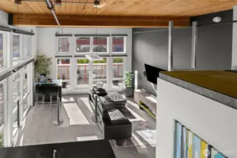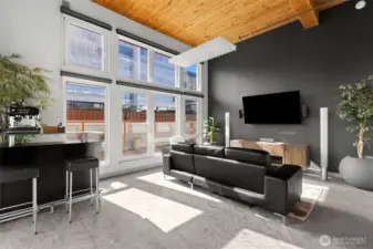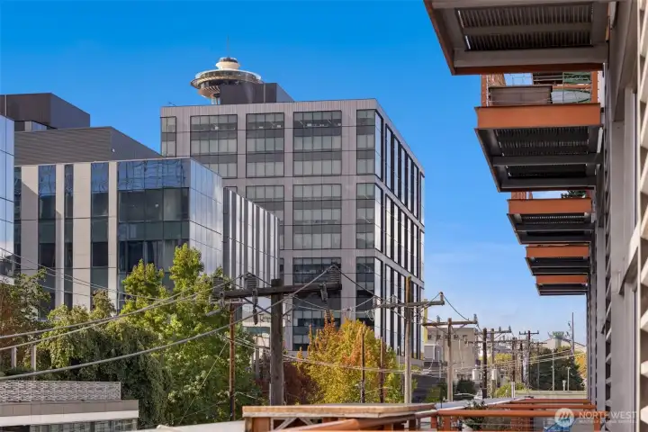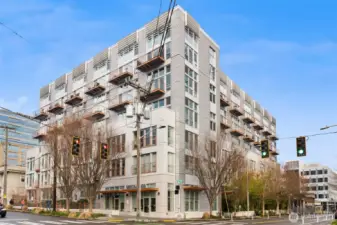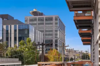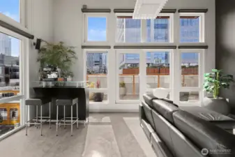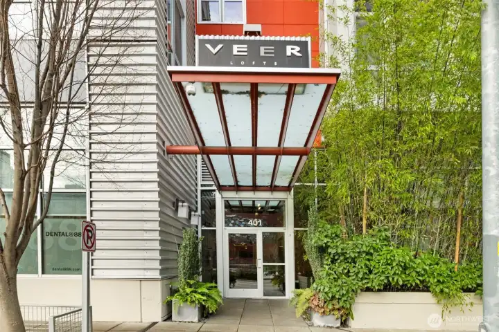 Experience the best of city living in this stunning corner unit at Veer Lofts. Soaring ceilings and open-concept design create an airy, modern space ideal for entertaining or everyday comfort. The sleek kitchen with stainless steel appliances seamlessly connects to the living and dining areas. A versatile 300 sqft loft (not included in total sqft) offers flexibility for a bedroom, office, or extra storage. Enjoy an oversized private patio with Space Needle views, secure parking, private storage, and community perks like a pet wash and BBQ courtyard. With a Walk Score of 98, dining, parks, and transit are all just steps away.