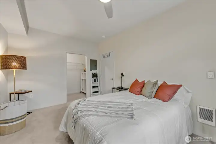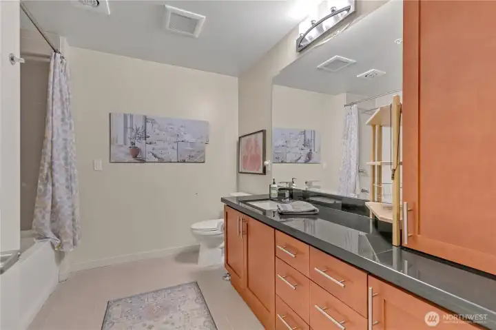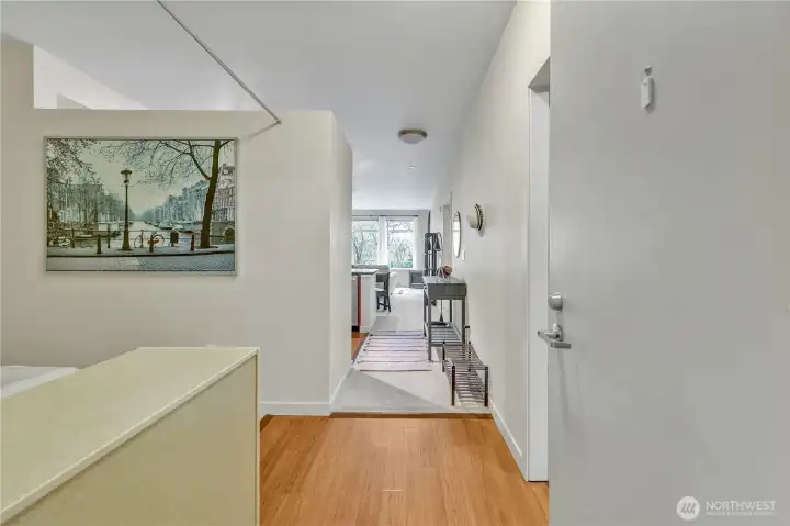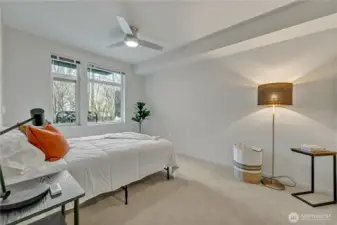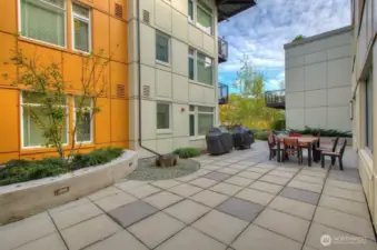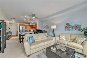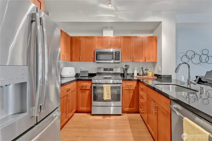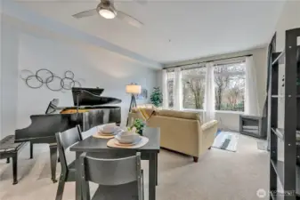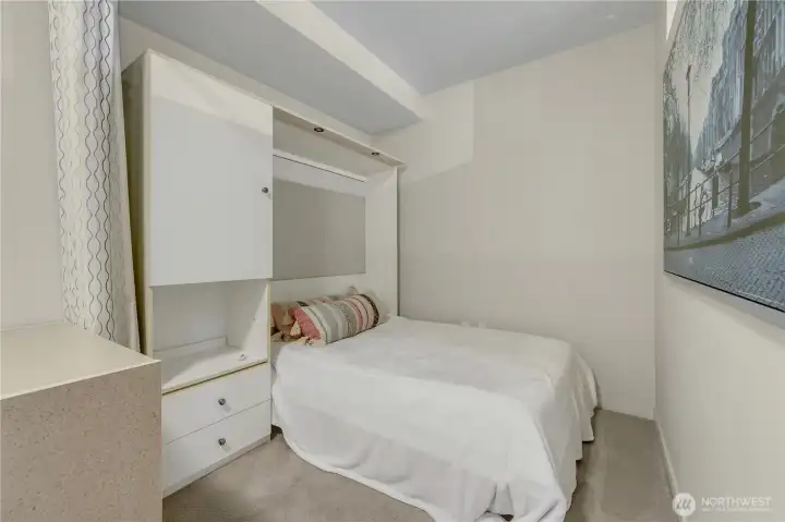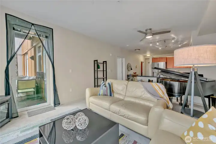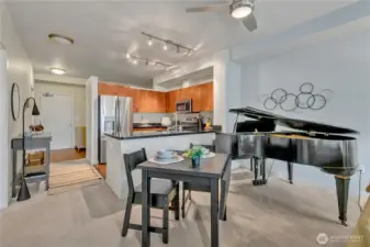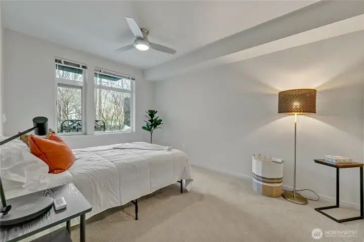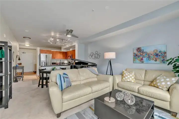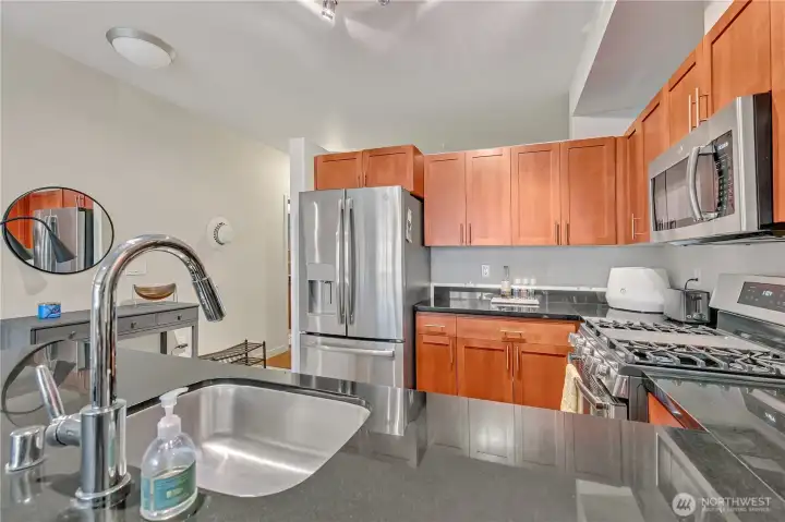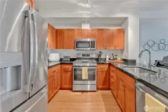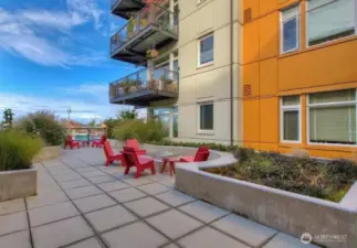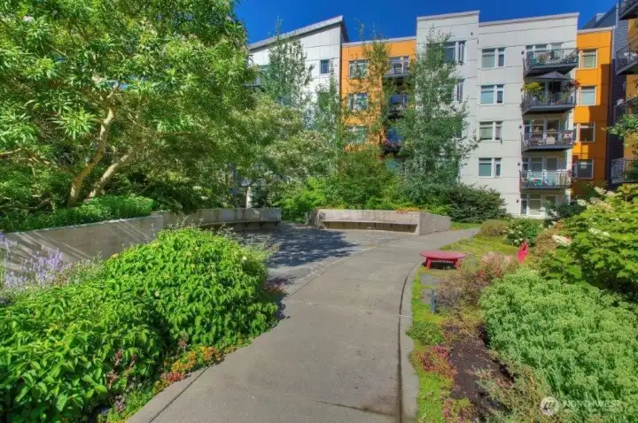 Wonderful light filled condo on 1-level (no stairs required). Features 1 Bed/1 bath & Den. Building features secure access via lobby entrance w/elevator or stairs or garage, 1 parking space (compact car size). This Condo is on the courtyard level, features a East facing patio w/sunny exposure. Kitchen w/granite & stainless appliances (gas range). Den w/a professionally installed Murphy Bed. Bathroom has luxuriously deep tub. BLDG has BBQ's, an exercise room, a Community Room, a Roof Top Deck, a Fire Pit area. Walk to the Transit Center, shopping, restaurants. Just steps from the weekly Farmer’s Market, library and a small dog park, with SeaTac Airport only a short drive away. Friendly neighbors & atmosphere! Seller has 3.25% Assumable Loan!
