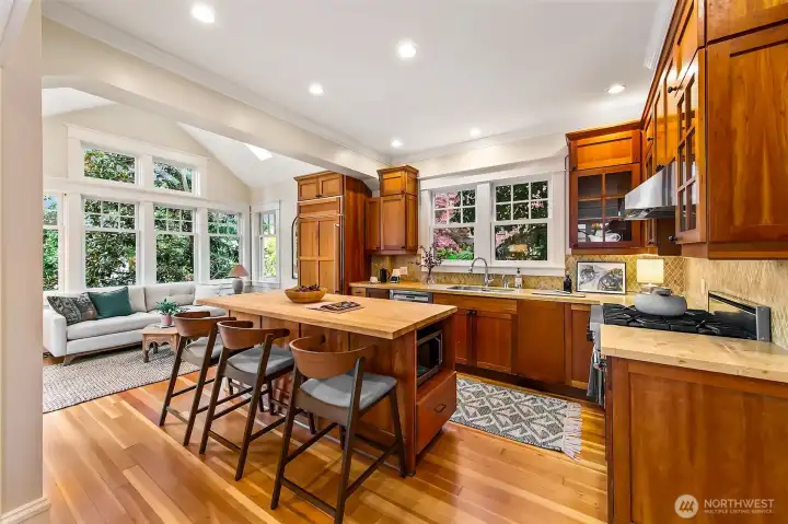 Located on one of the best streets in Laurelhurst ~ The quintessential 1909 Seattle Craftsman: Clinker brick chimney, covered front porch, deep eave roofline defined with corbels. Fir floors throughout the main level were recently refinished and open rooms mean easy entertaining. A vaulted family room off the kitchen pulls in generous natural light. Two sets of French doors create indoor/outdoor flow to the elevated deck and backyard. Upstairs find 3 well proportioned bedrooms with walk-in closets and a large bath. The lower level is a cozy living space with fireplace and built-ins, guest quarters and plenty of storage. Move in ready, host for the holidays and enjoy the Laurelhurst Beach Club next summer.