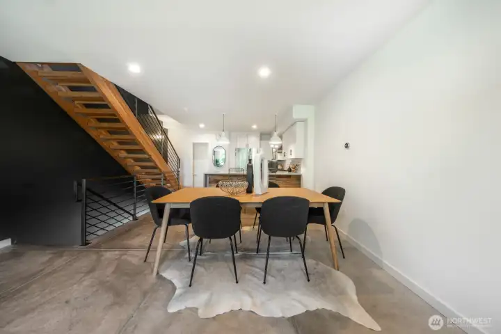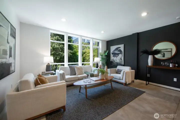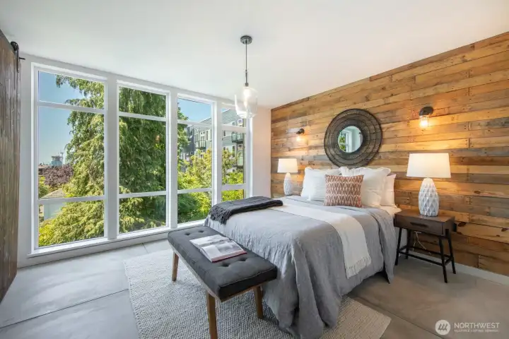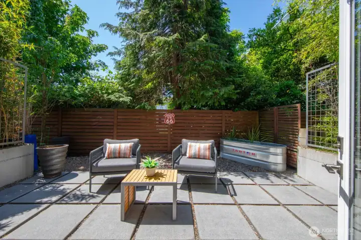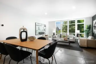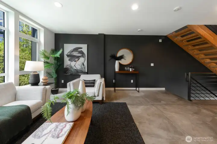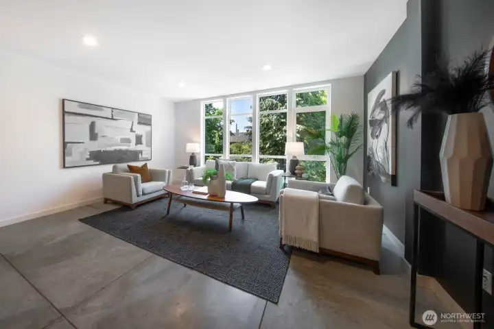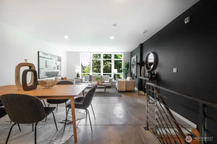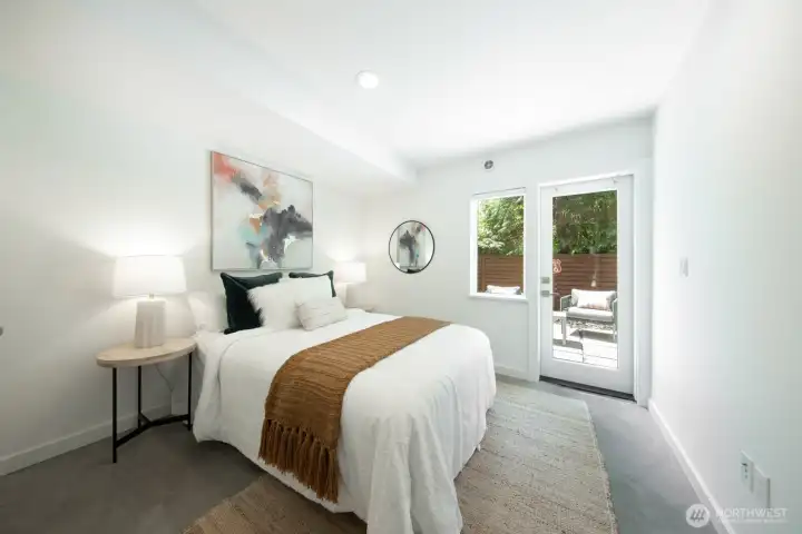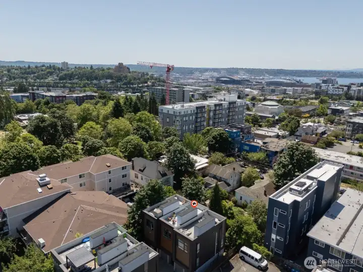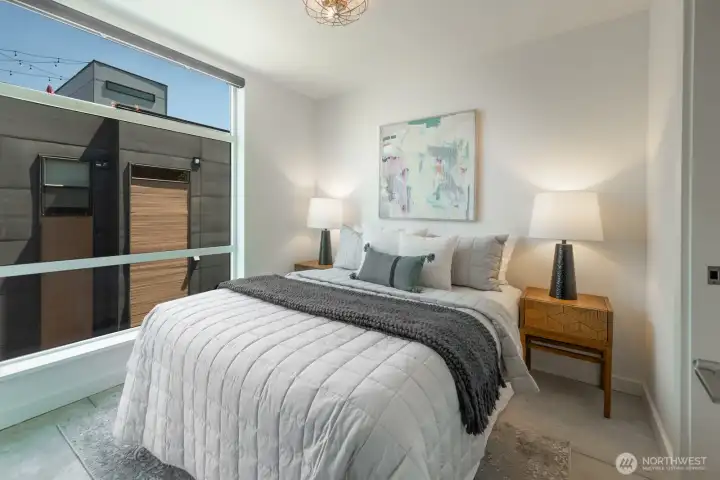 Stylish, spacious, and perfectly located—this light-filled townhouse has it all! The huge-wide open main floor features a sleek kitchen that flows seamlessly into a generous sized dining and living area, framed by floor-to-ceiling windows overlooking your private patio & offering tons of natural light. Upstairs, the west-facing primary suite offers double closets and a full bath, plus an additional bedroom. A lower-level bedroom with adjacent bath is perfect for guests or a home office. Polished concrete floors, floating staircases, and timeless finishes throughout. Enjoy sweeping city, Sound, and mountain views from the rooftop deck. Tucked away in a quiet spot with easy access to downtown, freeways, dining, and more! Don't miss this one!