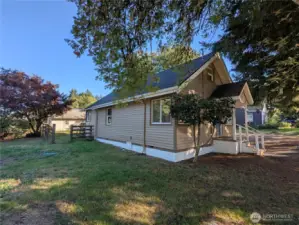 Why buy a townhome or condo when you can buy a house on a spacious .26 acre lot with a wonderful mature evergreen tree in front and plenty wildlife around! There are two bedrooms downstairs and one bedroom plus bonus room with closet upstairs. New paint inside and out plus new flooring throughout! New butcher block kitchen countertop awaiting your choice of oiling or sealing. Large utility room with sink, half bathroom, washer and dryer hookups, plus door to the backyard. Vinyl windows all around and vinyl siding. Detached one car garage next to the house. Easy access to bus stops, schools, I-5, shopping, and downtown Olympia. Olympia school district and no HOA with their dues! Buyer to confirm schools.