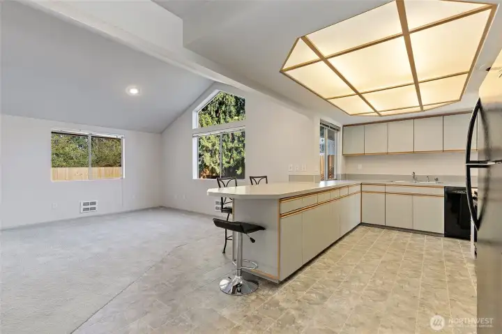 Welcome to this beautifully refreshed home offering a spacious one-level layout with both a living room and a versatile den—perfect for work or relaxation. Vaulted ceilings create an airy, open feel throughout. Enjoy the convenience of a freshly painted interior, brand-new carpet, brand new roof, heat-pump & a new fully fenced, flat backyard with an entertaining deck ideal for gatherings. Radiant heated Luxury Vinyl Tile flooring throughout kitchen, hallway, & dining room area. The extended two-car garage provides extra storage space, & the quiet residential street enhances the sense of retreat. Located less than 5 minutes to Alderwood Mall & the upcoming Lynnwood Light Rail Station, this home offers the perfect blend of comfort & location.