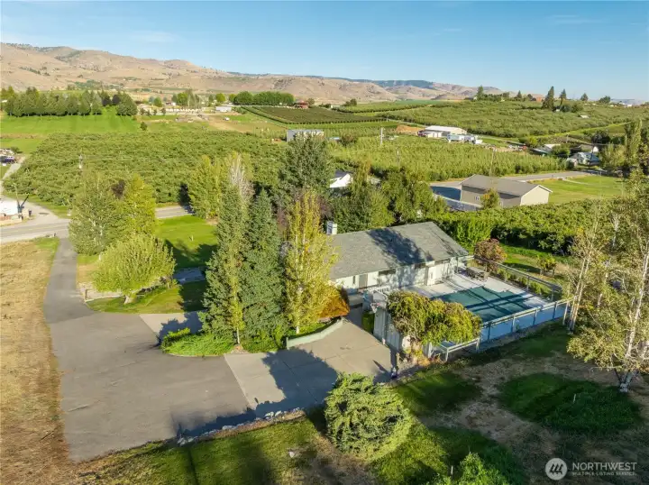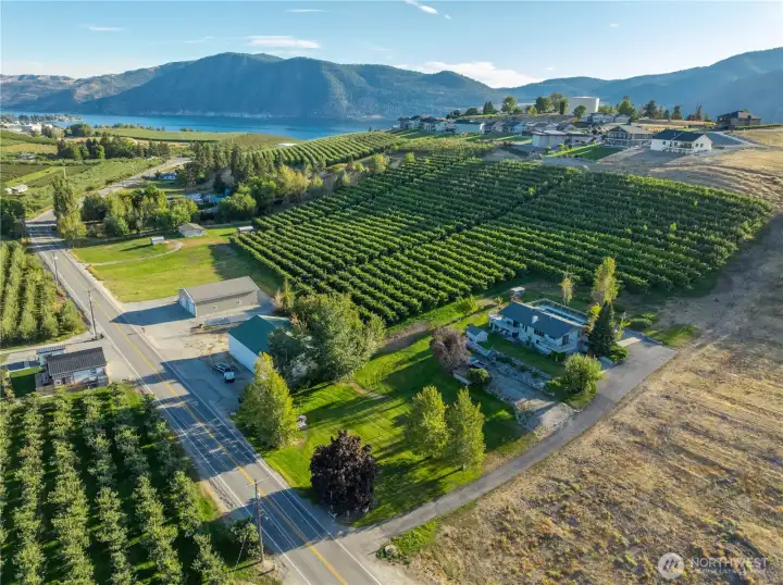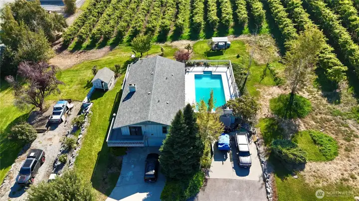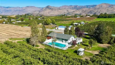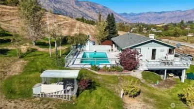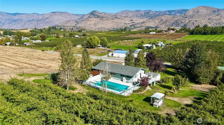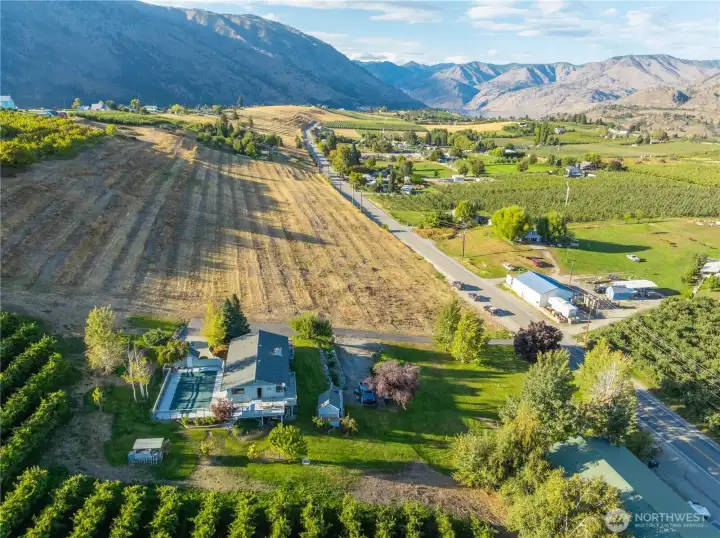 Nestled on nearly an acre surrounded by orchards and mature landscaping, this property offers sweeping valley views stretching north toward the beloved Blueberry Hills Restaurant. The beautifully terraced grounds feature an in-ground, fully fenced concrete pool w/ a vinyl liner—perfect for summer gatherings beneath the Chelan sun. The gently sloping parcel extends toward Manson Boulevard, where a spacious, level area below provides the ideal setting for a future detached shop/ ADU. Enjoy the tranquility of rural living just minutes from Manson’s village center, boutique wineries, and the crystal-clear waters of Lake Chelan. An exceptional opportunity to reimagine this estate—being sold in as-is condition—to make it your own country retreat.