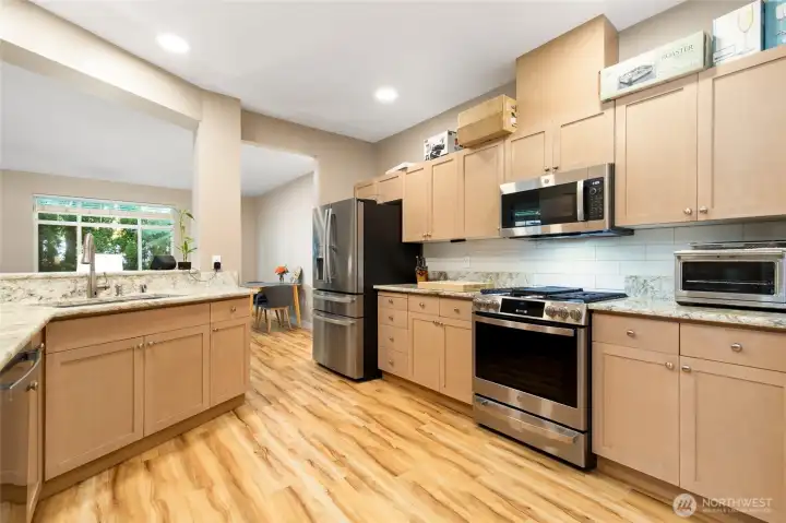Conveniently located and move-in ready townhome in desirable Cheswick Lane. Thoughtfully refreshed with new interior paint, LVP flooring, LG washer/dryer, GE Profile kitchen appliances, solid wood trim, & central A/C. Main level offers an open floor plan with spacious living & dining areas, a well-appointed kitchen, bedroom, & updated full bath. Upstairs, a versatile loft is ideal for office, media, or hobbies. The primary suite features a fully renovated bath with vessel tub, heated floors, new vanity, & walk-in closet. Low dues cover exterior, roof, & common areas; roofs replaced in 2022. Includes newer tankless water heater, 2-car garage, USB ports & smart-wire ready. Prime location near shopping, services, & top Lake Washington schools.