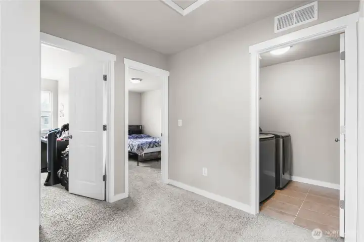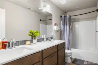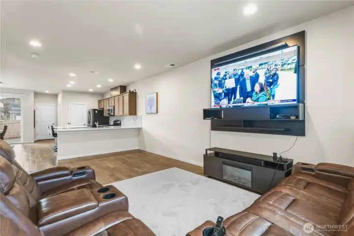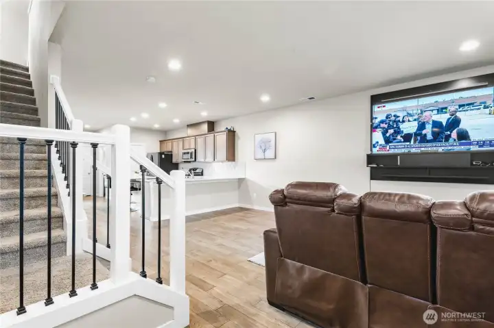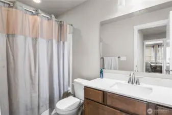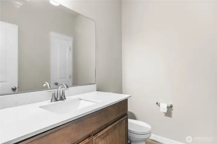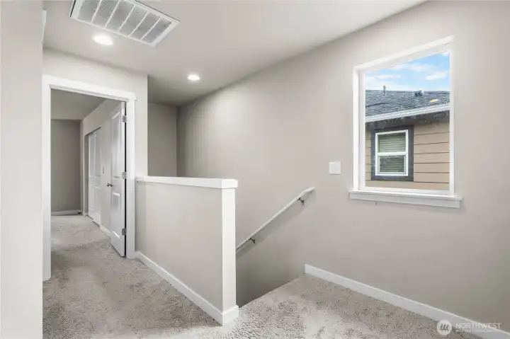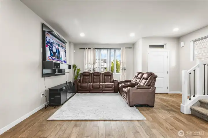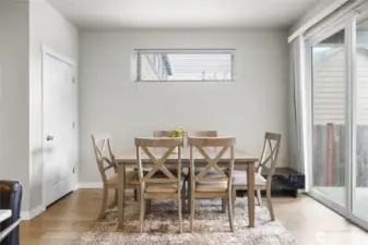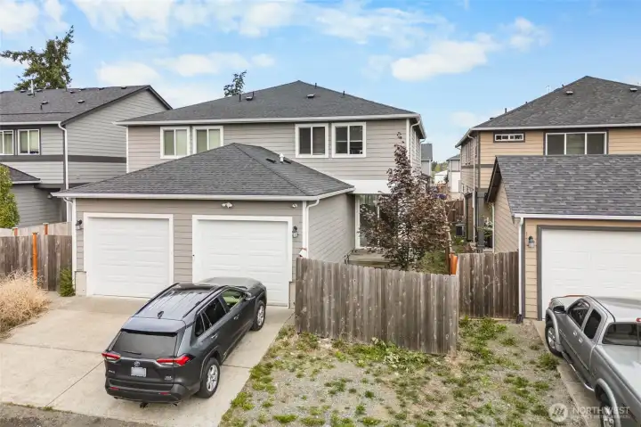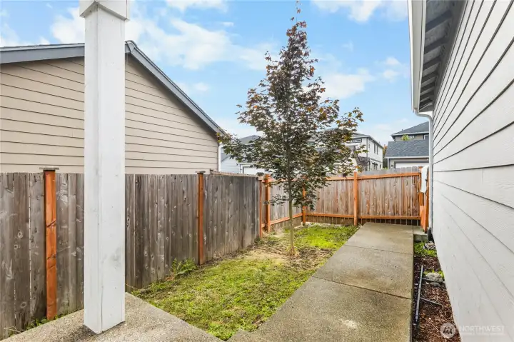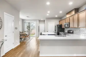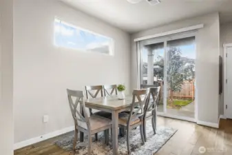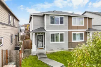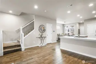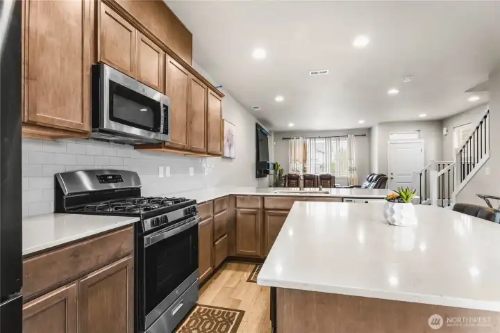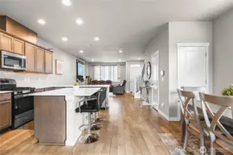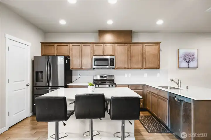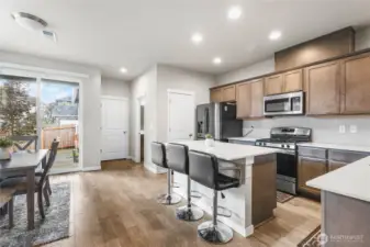 Beautifully maintained with engineered hardwoods and curated finishes. The open kitchen features quartz counters, wood cabinets, stainless appliances, and a dining bar. Dining area opens to the patio with fully fenced side yard. Upstairs you will find the primary suite with private bath and two more spacious bedrooms. Utility room also conveniently located upstairs.