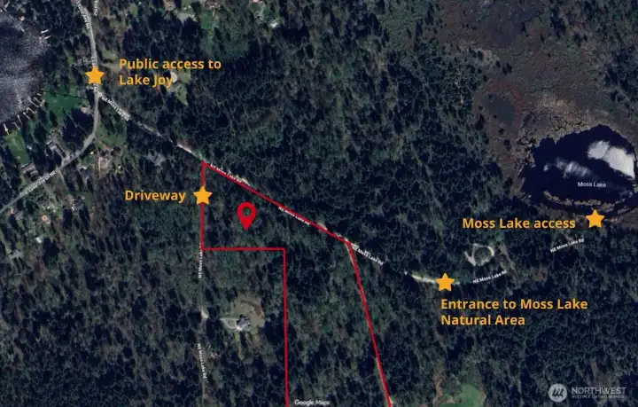 Beautiful mature forest spanning 20 acres in the Lake Joy neighborhood. Less than a 5 minute walk to both the Lake Joy public access and Moss Lake Natural area entrance. Two large building areas (NW quadrant or Southern half) with gently rolling topography and lots of options for home placement and opportunity to sub-divide. The well was dug in 2019 along with the construction driveway and small area cleared. Power is at the street. The Lake Joy loop is a pleasant 2.5 mile neighborhood walk, surrounded by private homes and water access for non-motorized boats right down the street. The Moss Lake Natural area is 372 acres with three miles of trails for hiking, mountain biking, and horseback riding, and water access for kayaking and non-motorized boats.