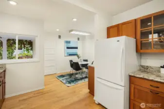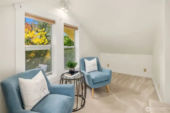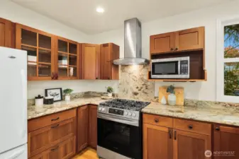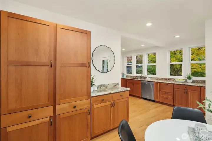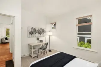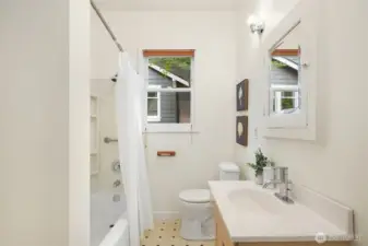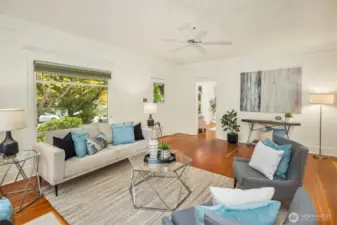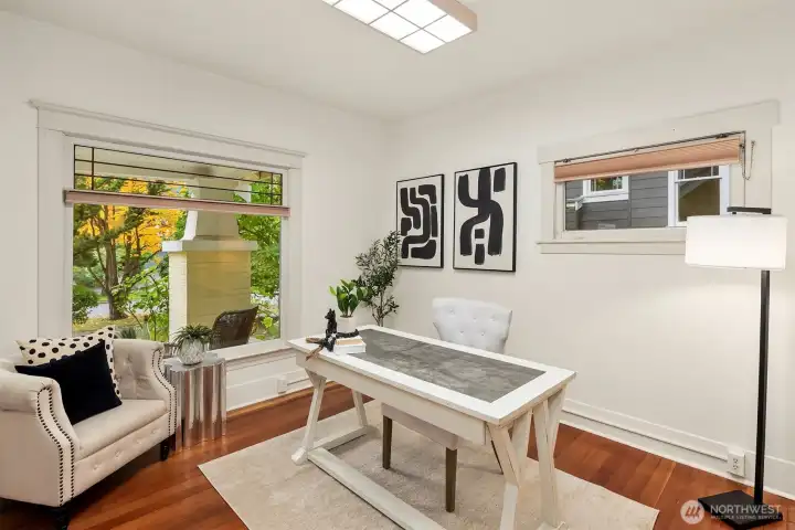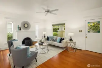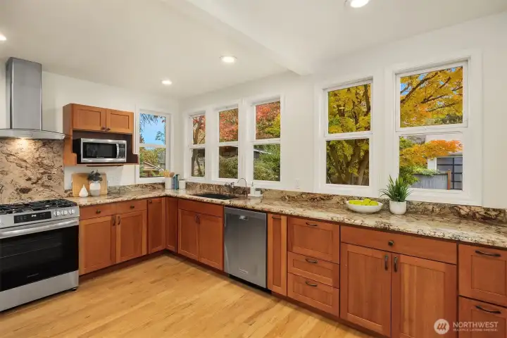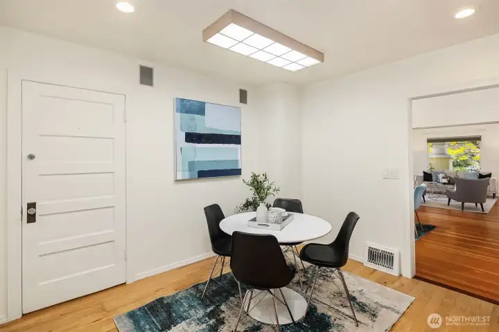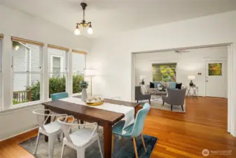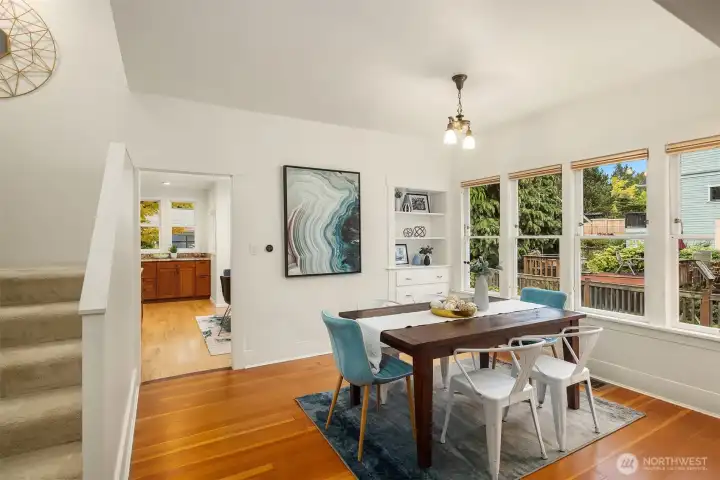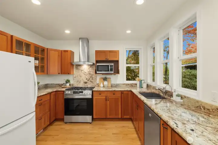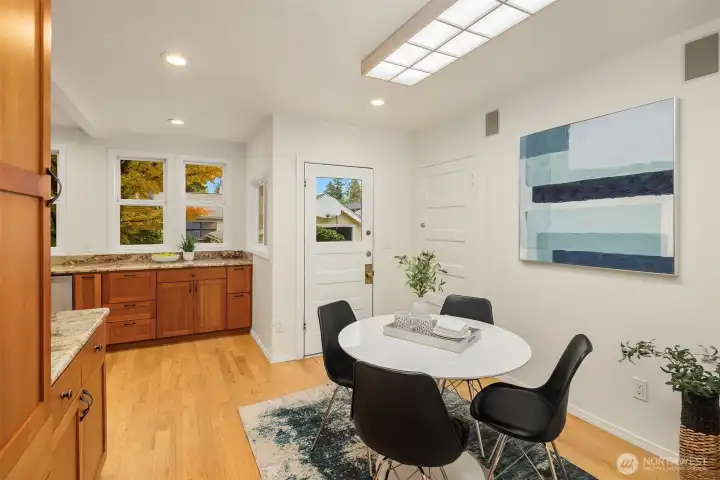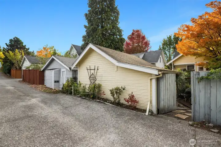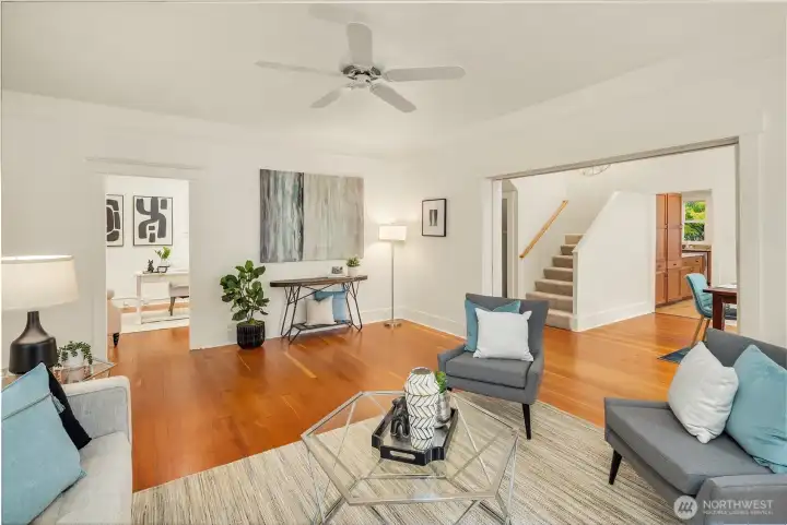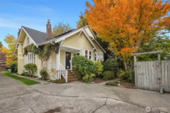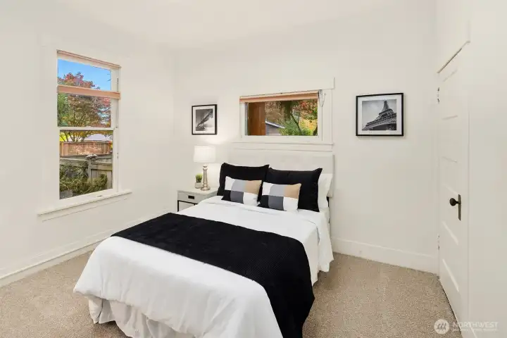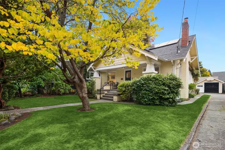 Charming and inviting Green Lake Craftsman just blocks from Tangletown and the lake! Set on a spacious lot with mature landscaping, this home blends timeless character with modern updates. Fresh interior paint, updated kitchen, and improved electrical and plumbing systems offer comfort and peace of mind. Sunlight fills the warm wood-floored main level featuring a cozy dining room, two bedrooms, and a full bath. Upstairs includes two additional bedrooms, a bonus den or sitting area, and another full bath. The finished basement adds a recreation room, a half bath, a laundry, and ample storage. Solar panels enhance energy efficiency. Enjoy the private patio, detached garage, alley access, and off-street parking. Pre-inspected
