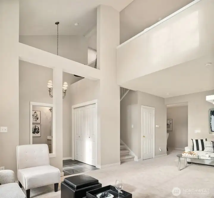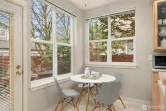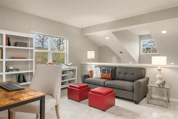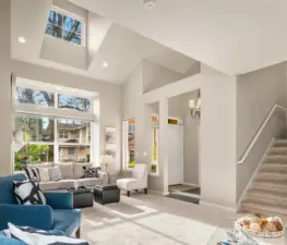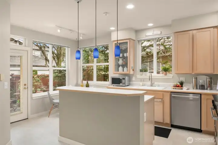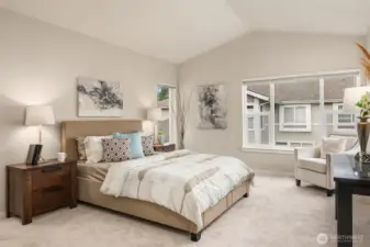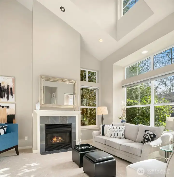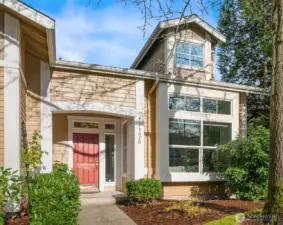 Trailside living in the heart of Redmond! This bright end-unit townhome in coveted Rivertrail offers one of the largest floorplans at 1,725 sq ft. Features include 2 bedrooms, 2.5 baths, a loft/office, soaring ceilings, skylights, and new flooring throughout. The kitchen opens to a private dining area, while a cozy gas fireplace anchors the light-filled living room with extra windows. Vaulted ceilings enhance the spacious primary suite with ensuite bath featuring a soaking tub, walk-in shower, generous closet space, and additional skylight. Enjoy A/C, newer furnace, laundry room, window coverings throughout, and a rare 2-car garage with ample guest parking. A private patio backs to a quiet alley. Unbeatable convenience with direct access to the Sammamish River Trail—perfect for walking, biking, and enjoying the outdoors. Minutes to shopping, dining, community parks, Light Rail, Microsoft, Meta, and top-rated Lake Washington schools.