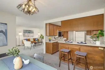 In the heart of Northgate, this light-filled 2-bed condo at Westbury Terrace offers unbeatable convenience near Northgate Mall, Light Rail Station & North Seattle College. No rental cap provides investment flexibility. Charming parquet entry flooring adds character, while brand NEW carpet &fresh paint create a move-in-ready feel. Enjoy territorial views from bright solarium-style alcove—perfect for a sitting area or reading nook. Inviting kitchen features abundant cabinetry & breakfast bar seating. Ready for your personal updates. Spacious Primary Suite. In-unit washer & dryer. Includes private storage unit & 2 parking spots. HOA covers water, sewer & garbage. Exterior remodel in 2022 w/ new siding, windows, roof, paint & elevator.