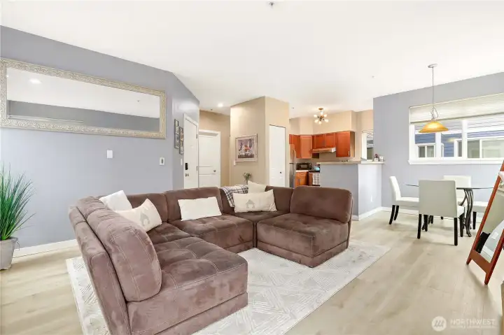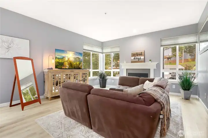 Charming condominium with oversize windows to bring in the natural light. The spacious living room features a wood-burning fireplace, and dining area. Newer flooring installed in 2022. Ample storage includes a large walk-in closet, extra hallway closet, and patio storage. Entry balcony perfect for seating area or planters. One assigned parking space right in front of the unit, as well as ample guest parking. The community offers a pool, fitness center, clubhouse, and playground; with dues covering water, sewer, and garbage. Convenient location, minutes to I-405, downtown Bothell, Kirkland and Woodinville. Easy commute to tech companies. No rental cap!