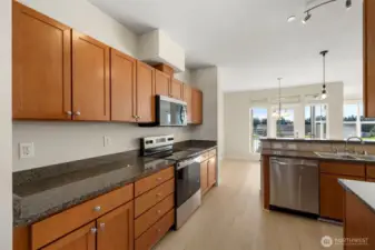 Gorgeous top-floor unit in the desirable Village Commons Condos! This spacious, open-concept layout is perfect for entertaining and feels incredibly roomy. The kitchen features stainless steel appliances, plenty of counter space, and great storage. The large primary bedroom includes a walk-in closet, an en-suite bathroom, double sinks, and a beautiful vanity area. The second bedroom is nicely sized, along with a second full bathroom. There's also a bonus room that can be used as an office or craft room. Enjoy the incredible view from the living room and balcony. Recently installed flooring, carpet, paint and more throughout. The building offers secure access, underground parking #6, and an elevator that takes you right to the top floor.
