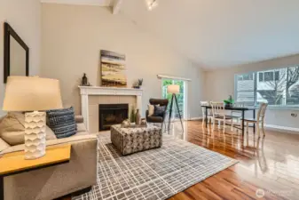 Huge Price Reduction! Experience the charm of a single-family home with the ease of condo living. This rare free-standing 2 bed, 2 bath condo offers 1,279 sq. ft. of well-designed space. Vaulted ceilings, tile entry, and a cozy wood-burning fireplace with crown molding create a warm, inviting feel. The open kitchen features a large island and stainless steel appliances, perfect for entertaining. The primary suite includes a walk-in closet and full en suite, with a second bedroom ideal for guests or an office. Enjoy a private covered patio, two parking spaces, no rental cap, and low-maintenance living, all minutes from I-5, light rail, and shopping.