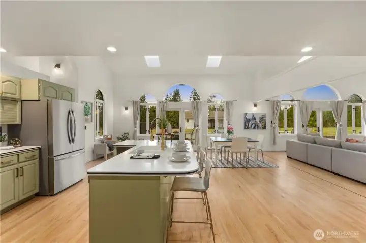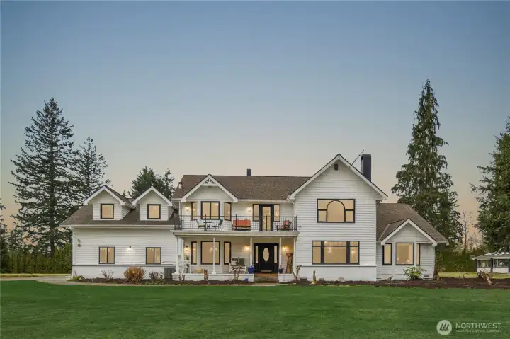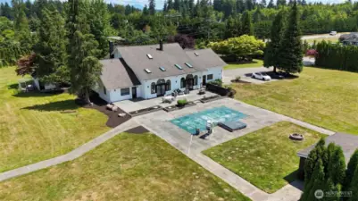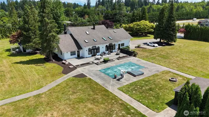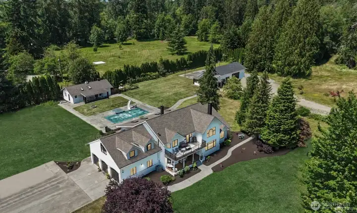This one-of-a-kind gated Lake Stevens retreat spans nearly 5 acres of park-like grounds with the comforts of country living, offering elegance, privacy, & recreation. The grand 4,366 sq. ft. main residence radiates sophistication, complemented by a 800 sq. ft. guest house. Designed for relaxation & entertainment, the estate boasts a heated pool, hot tub, & sports court. A Russian fireplace efficiently radiates warmth throughout, while the easterly front porch captures morning sun. The expansive workshop suits car enthusiasts, RV storage, or hobbies. Additional features include RV hookups, an EV charger, 800+ arborvitae hedges, a permanent greenhouse, & a peek-a-boo view of Mt. Pilchuck, all near Lake Cassidy, Centennial Trial, & Highway 9