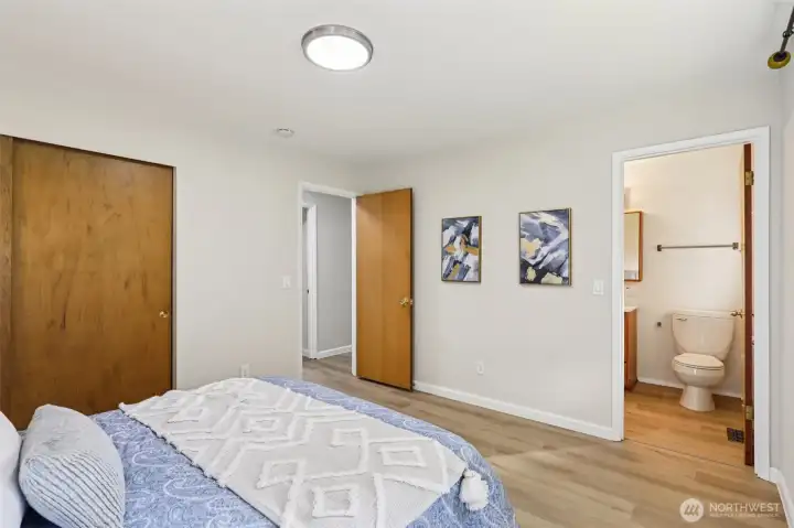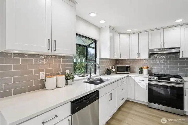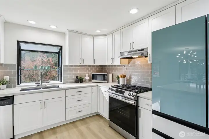 {East facing move-in-ready sought after Vasa Park home} Step into a freshly painted main floor with LVP flooring and an updated kitchen featuring shaker cabinets, quartz counters, and newer stainless steel fridge [25'] and gas stove. The dining area opens to a spacious covered deck with **stunning territorial and mountain views**- perfect for morning coffee or sunset gatherings. Upstairs offers a serene primary suite with 3/4 bath plus two more bedrooms and a full bath. The lwr level includes new carpet, large bonus room, spacious 4th bedroom, and flexible 5th bed or office, storage space that could be made into a MIL/ADU. Prime location near I-90, Sammamish, Microsoft, Vasa Park, and Bellevue schools! including Jing Mei Elementary (Choice)