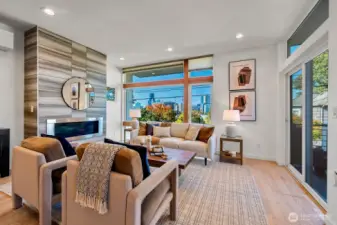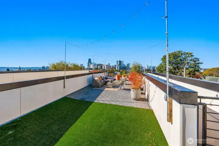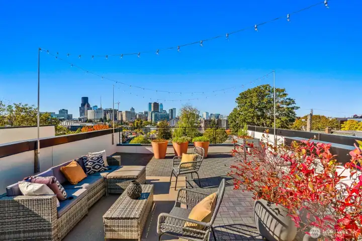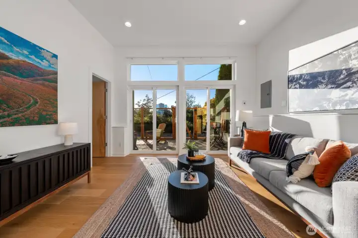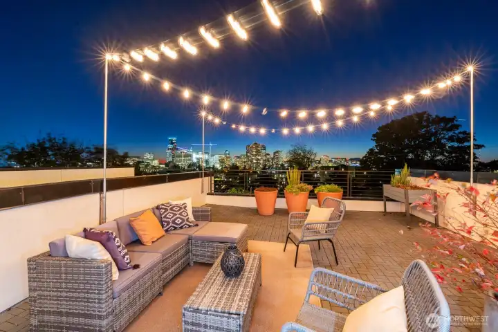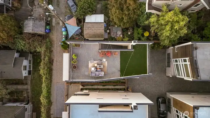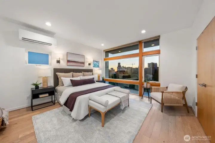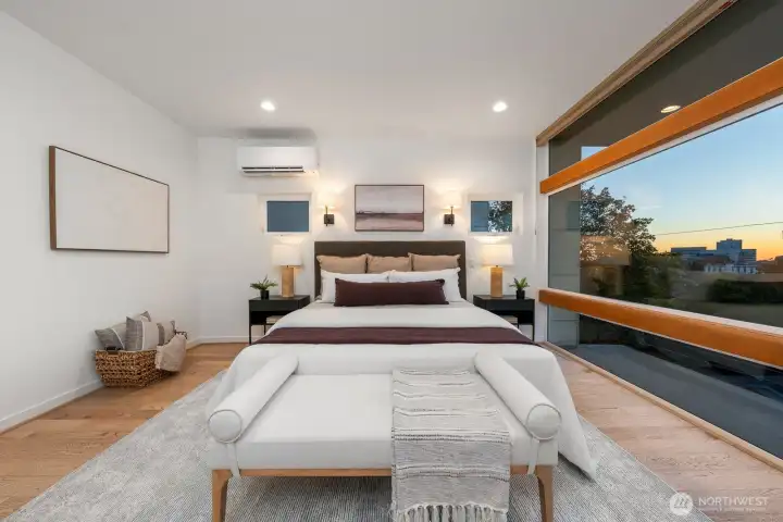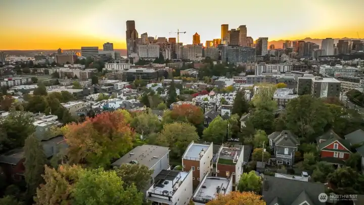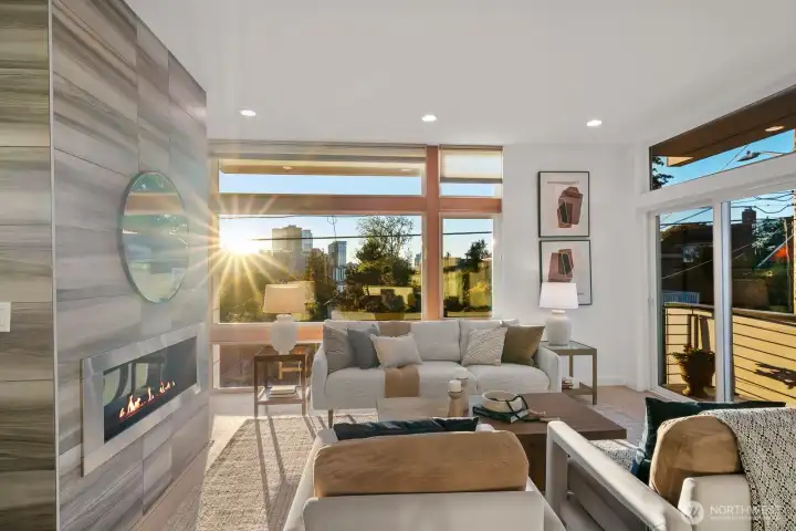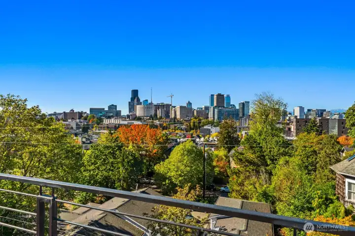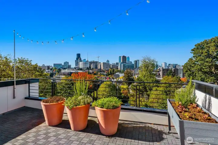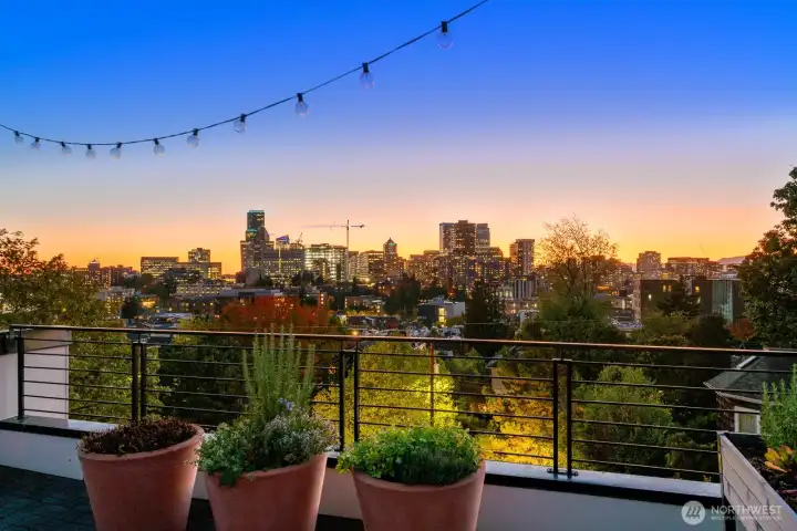 This modern, architecturally distinct stand-alone home has more than you thought you could hope for. Each space is bright and expansive. Unobstructed western views of the twinkling skyline and Olympics through walls of windows and from the breath taking roof deck. Every amenity is a delight. Each bedroom has an en-suite bath! Live in the heart of the city with remarkable spaces for entertaining. A first floor patio has easy gardens where every choice was well considered. The great room has living, kitchen, and dining that are connected yet distinct. The kitchen has recent premium appliances and a heart-of-the-home grand island. A new heat pump with AC gives year-round comfort. An attached garage, a walk score of 95, this is your happy home!