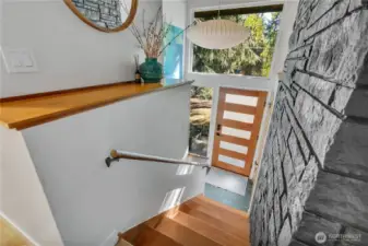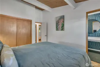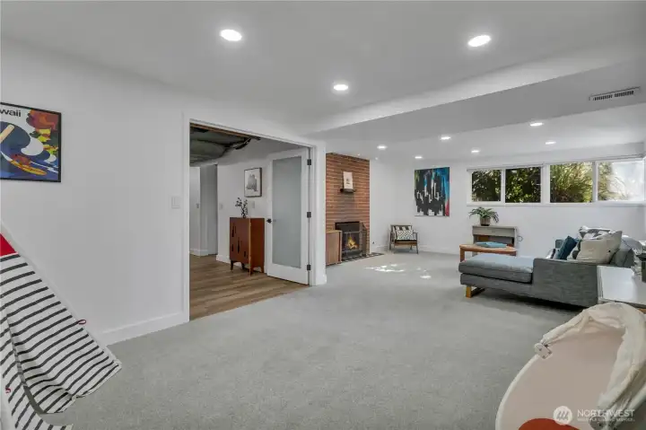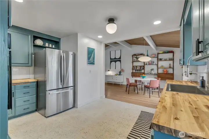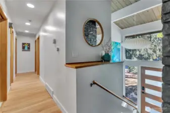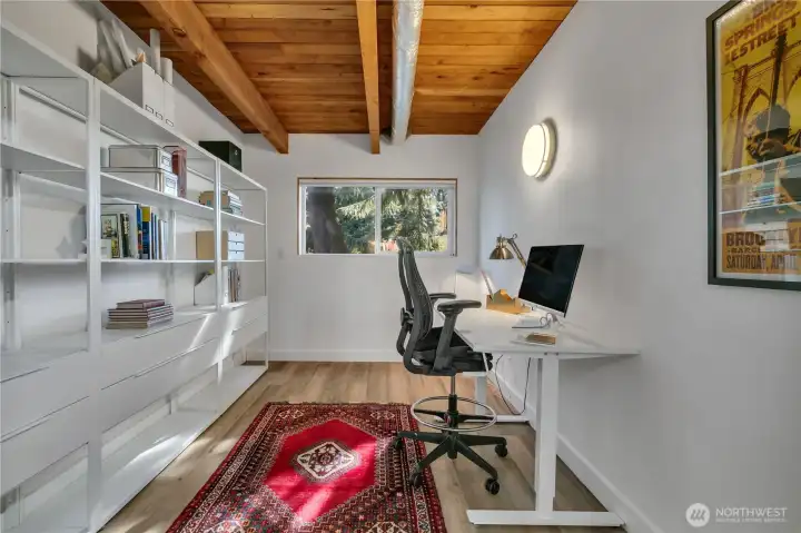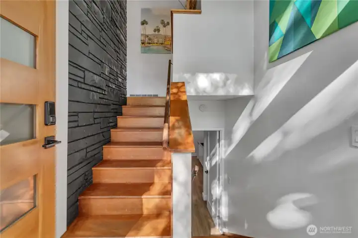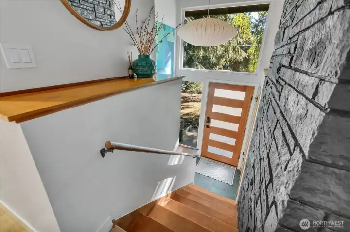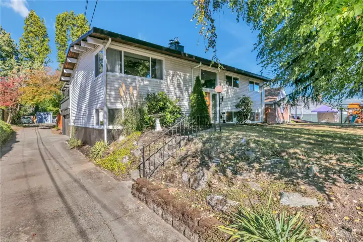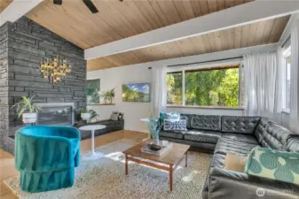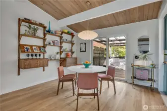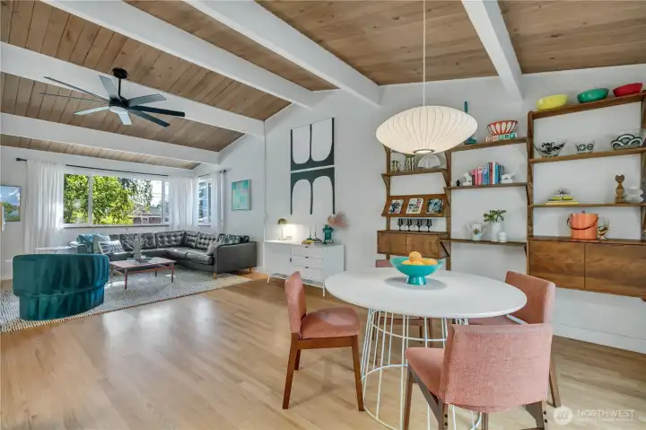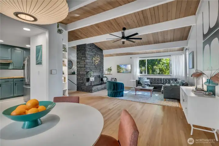 Effortlessly cool, this mid-century modern home showcases vaulted ceilings, exposed beams, and a bold stone-wrapped gas fireplace that anchors the living space. The stylish kitchen opens to a large, covered deck & private patio amid lush landscaping. Authentic George Nelson lighting and wide windows flood the home with light, highlighting beautiful hardwood floors. While the upstairs offers an exceptionally functional layout with 3 bedrooms and 1.5 baths, downstairs maintains the home’s cohesive aesthetic. Ideal for multi-gen living or a MIL/ADU, it features an oversized family room, bedroom, office, full bath, laundry, wet bar, & add’l storage. A cleverly designed carport with full-sized automatic garage door completes this mid-century gem