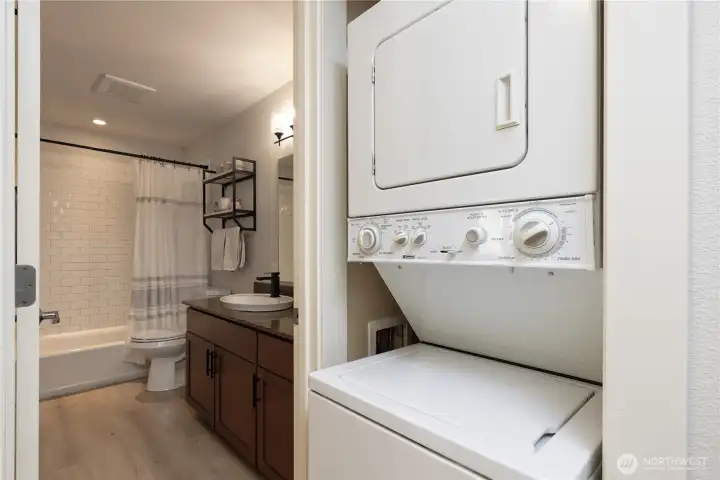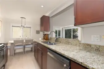 Welcome to this bright and stylish two-bedroom corner end-unit featuring 2022 LVP flooring, upgraded modern lighting, and only one shared wall for added privacy! The inviting living room flows into a kitchen with stainless steel appliances, granite countertops, and direct access to a spacious covered balcony—perfect for relaxing or entertaining. Enjoy the convenience of an in-unit washer/dryer and a designated parking space, with HOA covering WSG. Nestled in the heart of Ballard, a walker’s paradise, you’re moments from trendy shops, parks, the Sunday Market, and incredible dining!