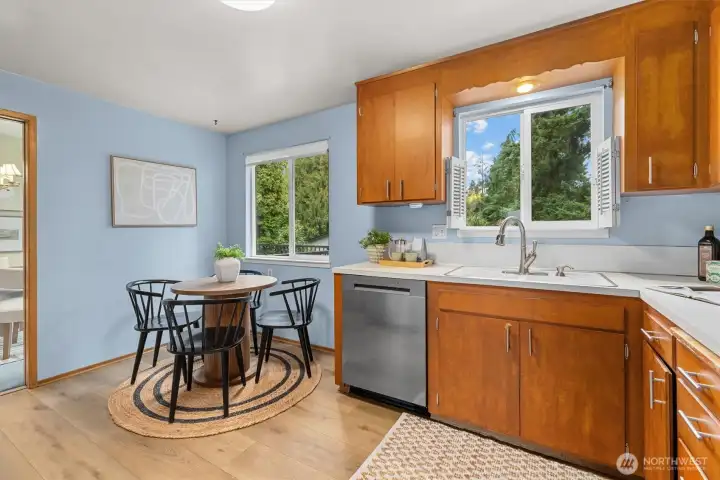 Original owners are leaving this amazing Shoreline gem behind, it awaits your finishing touches. Lovingly cared for and well maintained throughout the years. Upstairs, the hidden gem is the original hardwood floors under the carpet(!) and you'll find a spacious family room complete with a fireplace, formal dining area and back deck access while the kitchen boasts an eating nook and new vinyl plank floors. Down the hall, 2 large guest rooms, full guest bath and primary bedroom with it's own .75. Downstairs you'll find additional family space complete with a wet bar, .25 bath and back patio/yard access. The lot is huge, flat, well maintained and gets plenty of light. We are close to light rail, shopping and highly rated Shoreline Schools